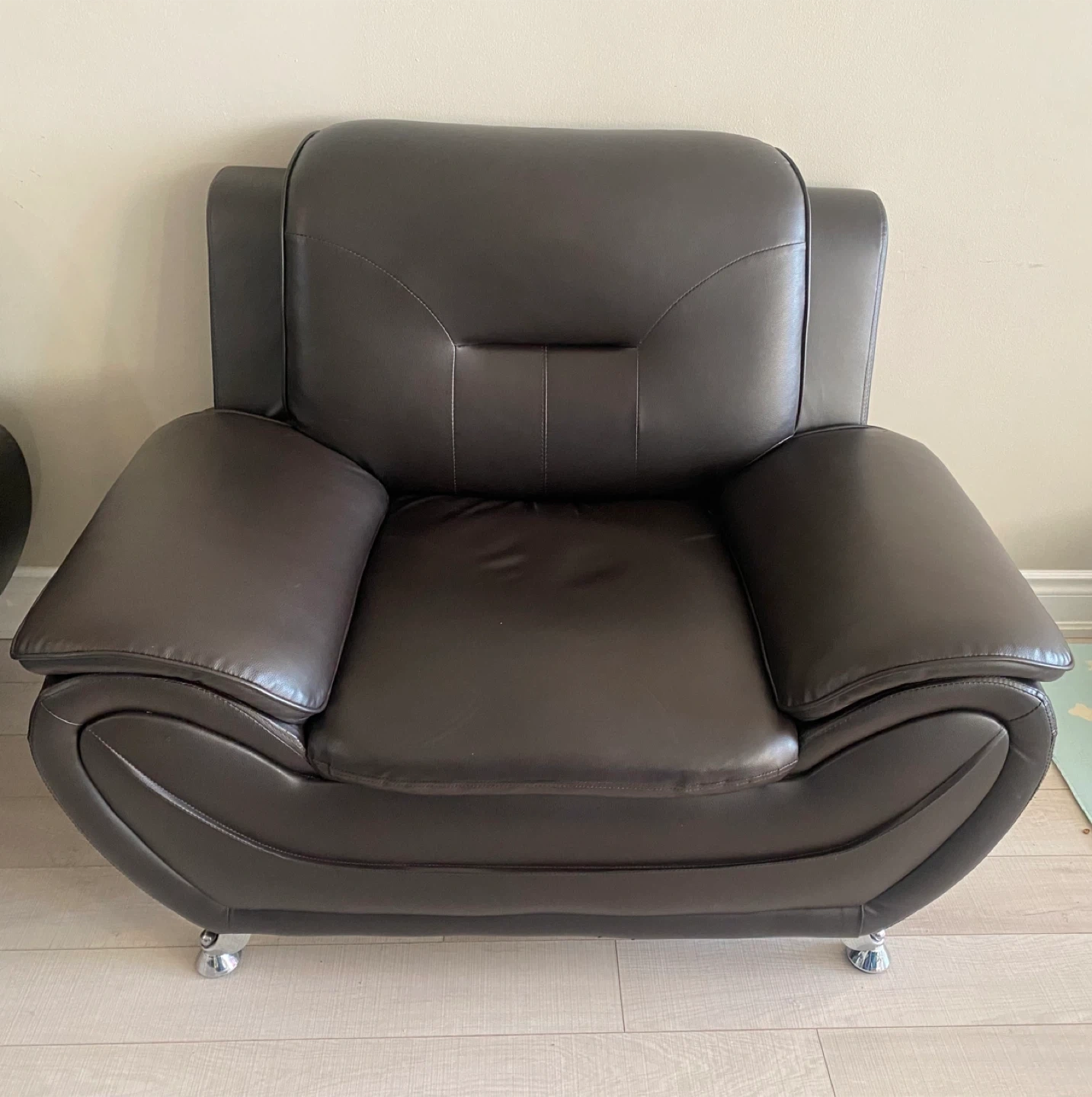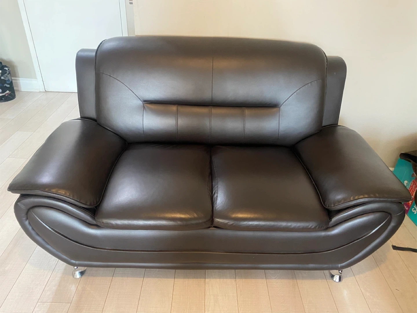 This is a dark brown faux leather loveseat two seater and single seater sofa . It's a two-seater and single seater sofa with plush cushioning. Suitable for a smaller living space or apartment or office or parlor