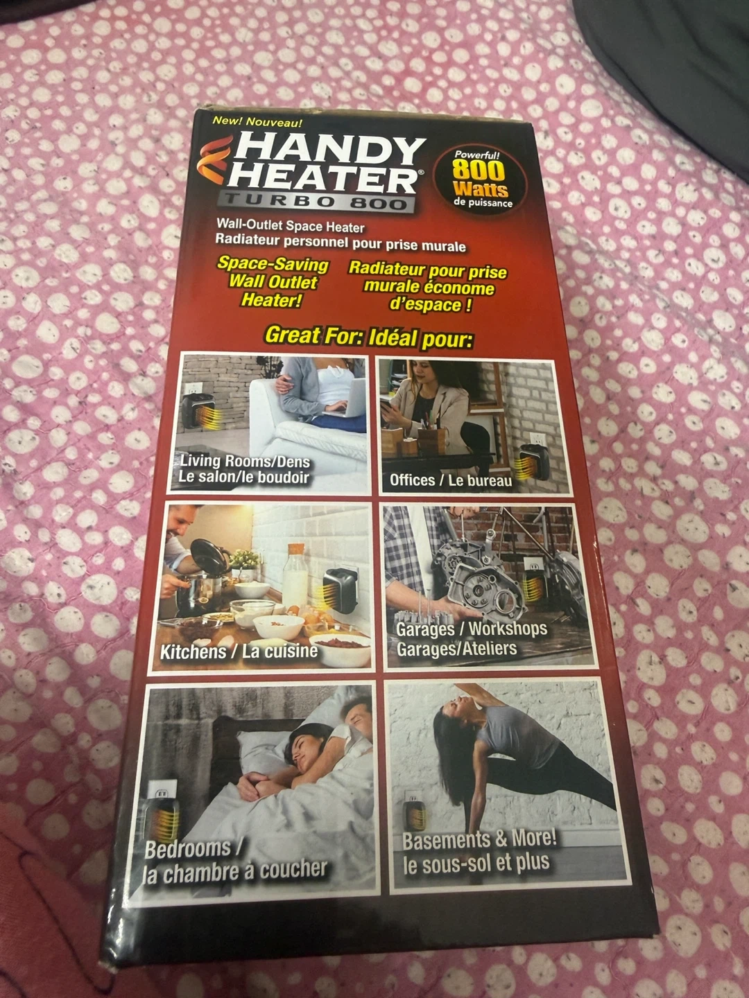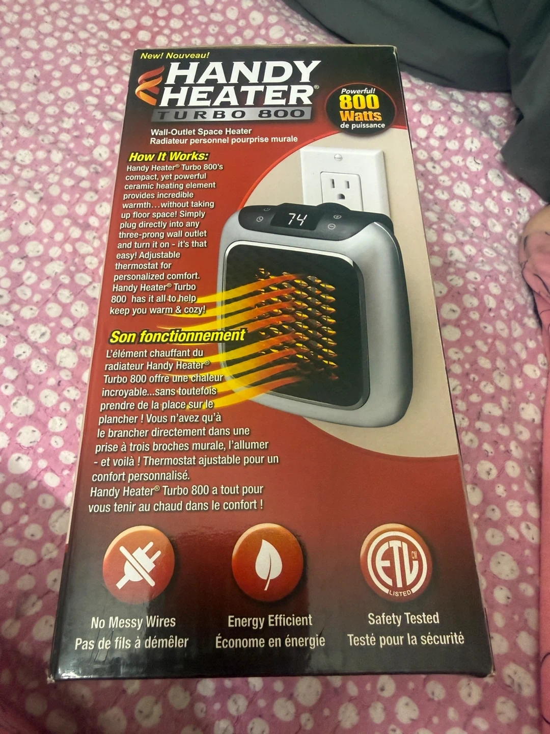 This Handy Heater Turbo 800 is a compact, wall-outlet space heater. It provides 800 watts of power and features a digital LED display. It also has a 12-hour programmable timer and adjustable thermostat.