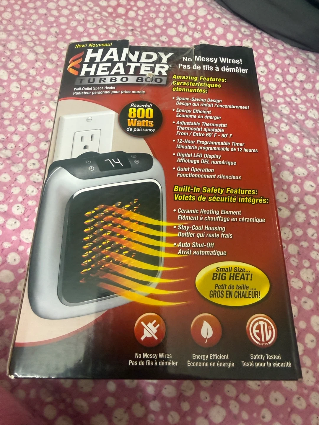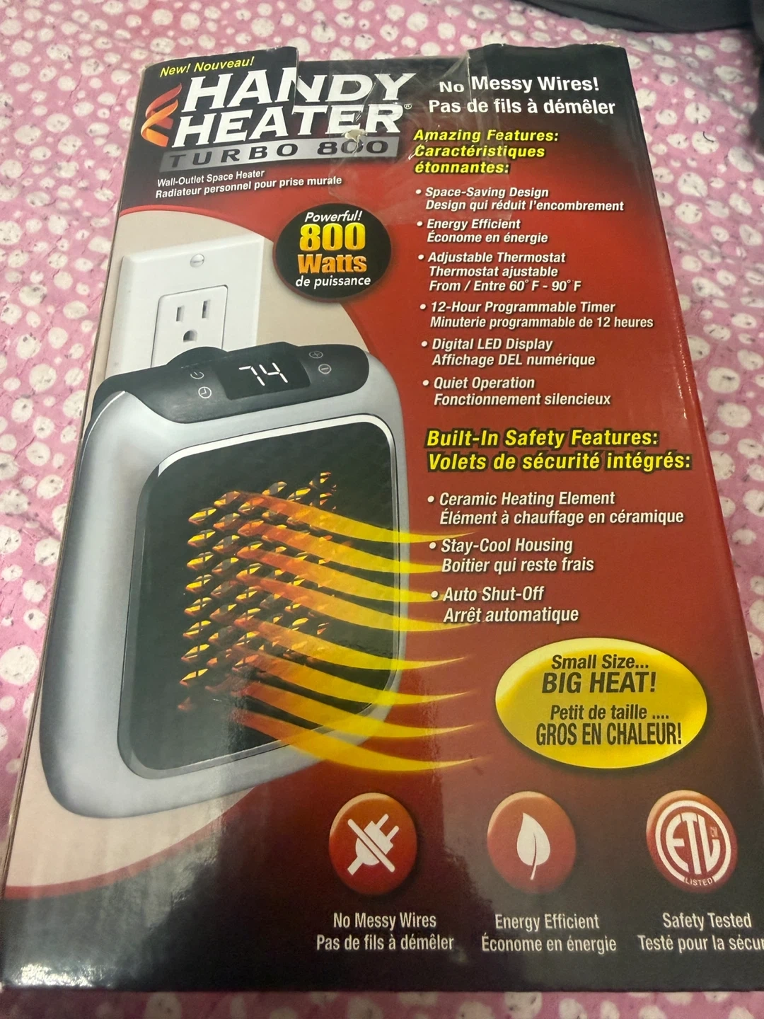 This Handy Heater Turbo 800 is a compact, wall-outlet space heater. It provides 800 watts of power and features a digital LED display. It also has a 12-hour programmable timer and adjustable thermostat.