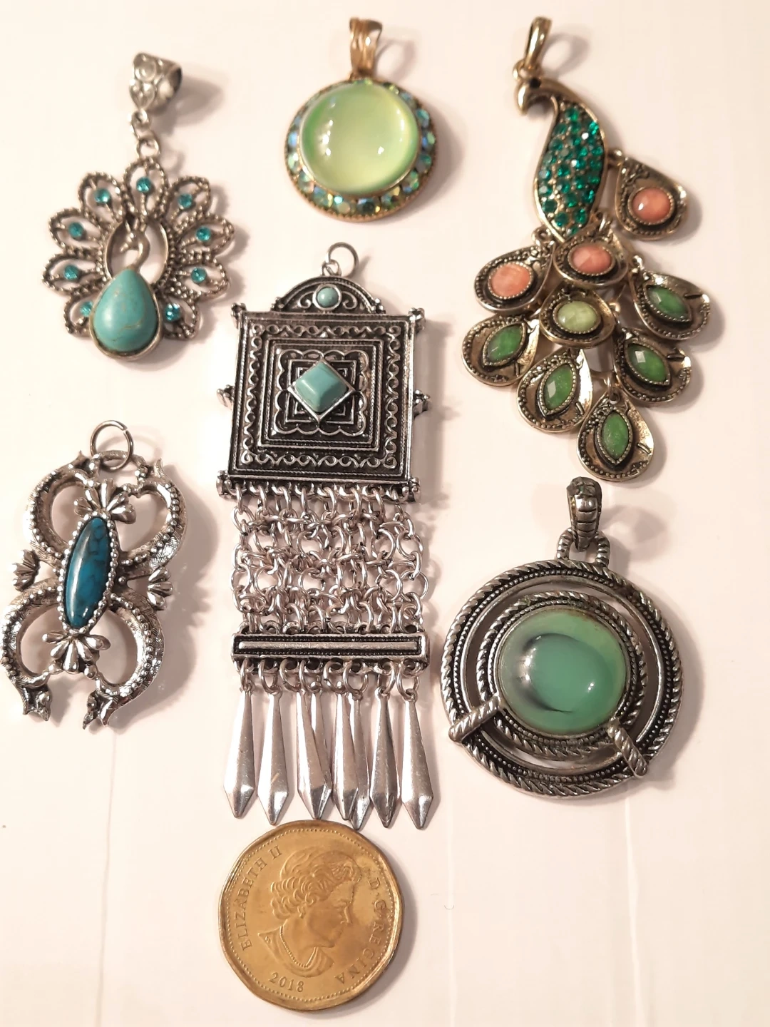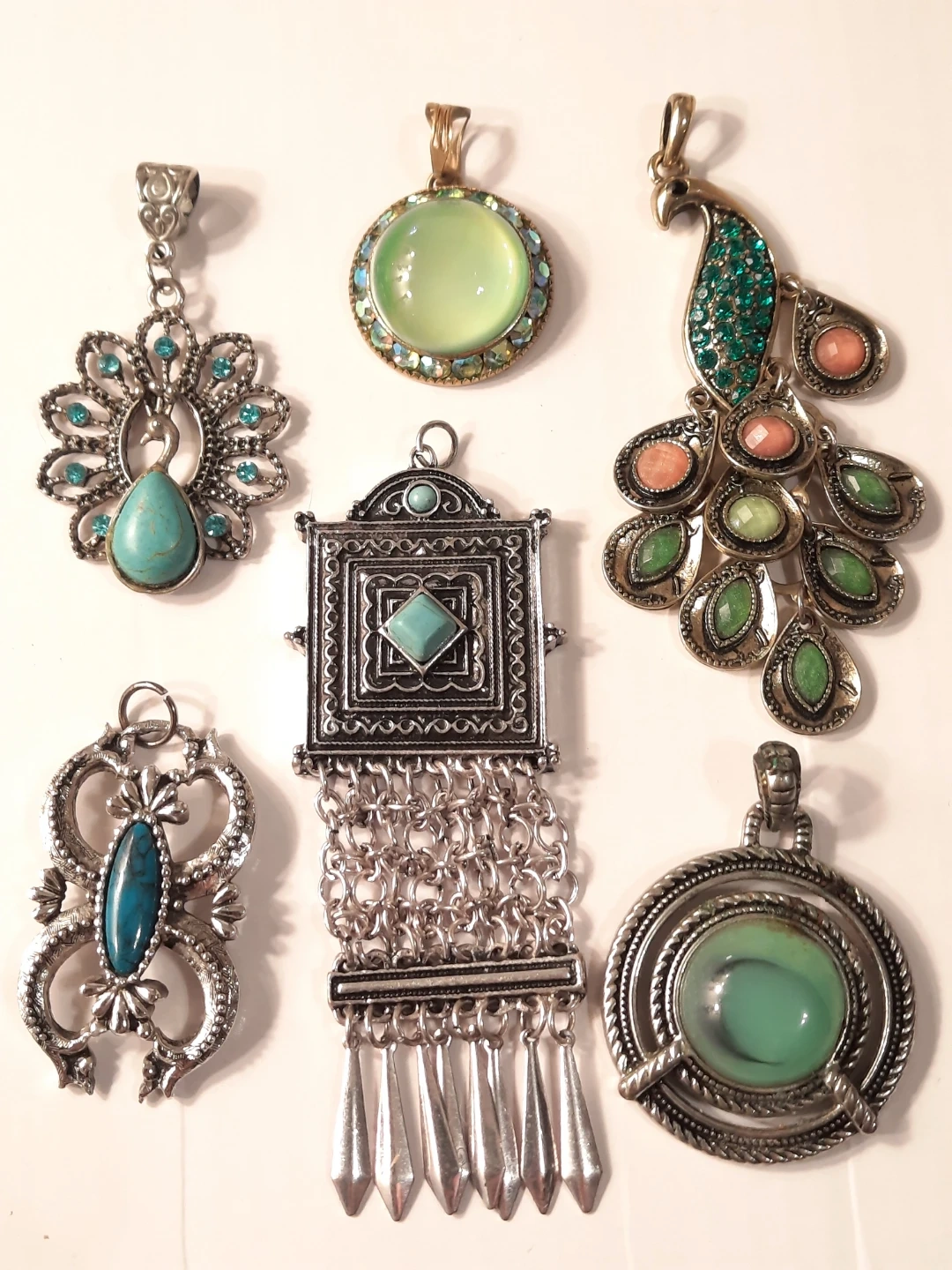A collection of six unique pendants, featuring various designs and inlaid stones. Includes a peacock-style pendant with green and coral-coloured stones, and a larger circular pendant with a smooth aqua stone. Metal is silver-toned. These pendants are great for adding a statement piece to an outfit.akazing blue green and turquoise pendants ..