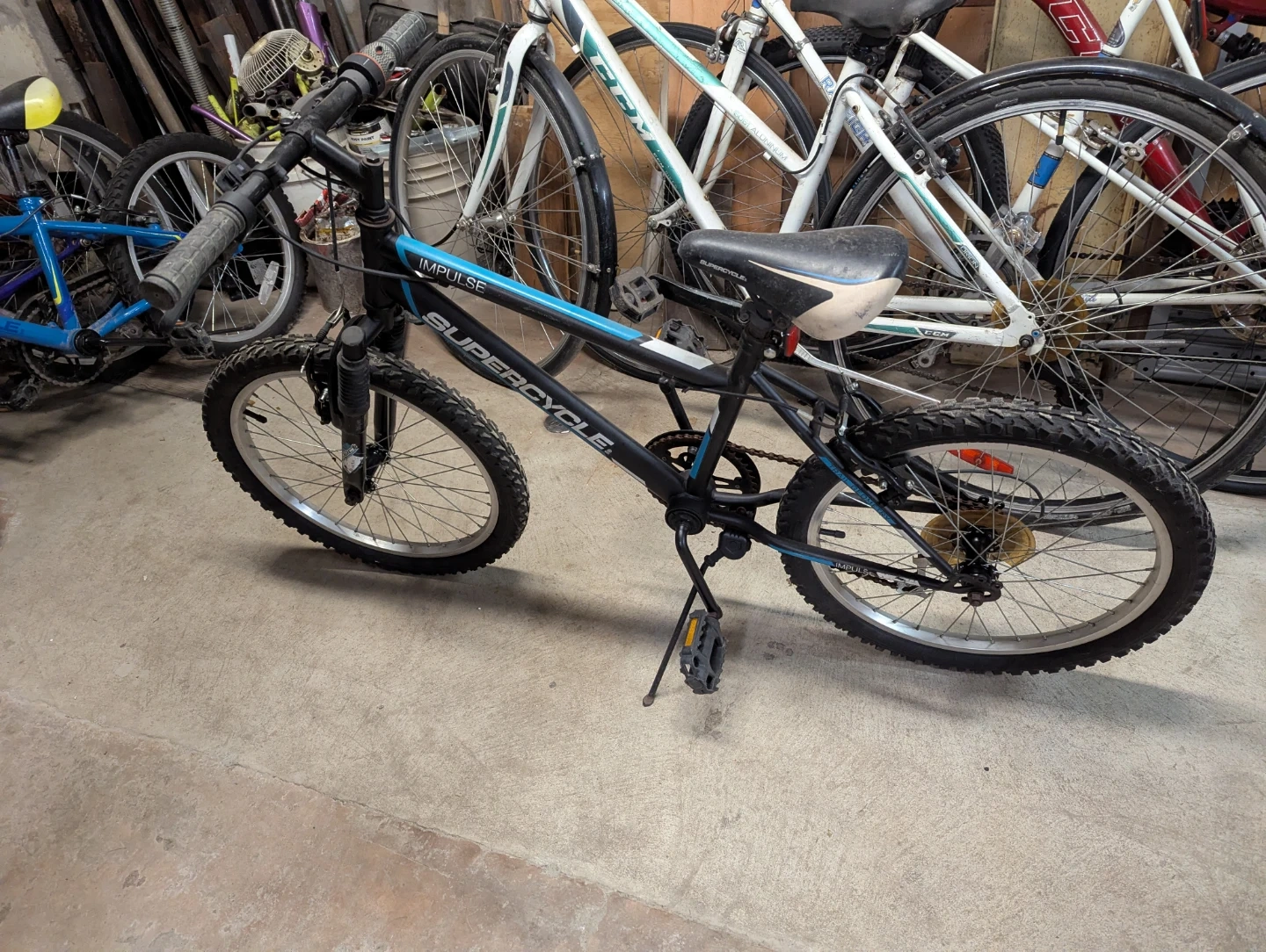 Supercycle Impulse youth bicycle in black and blue. It has a sturdy frame and knobby tires for versatile riding. Comes with a kickstand and front suspension fork.(Price is negotiable,need to get rid of soon)