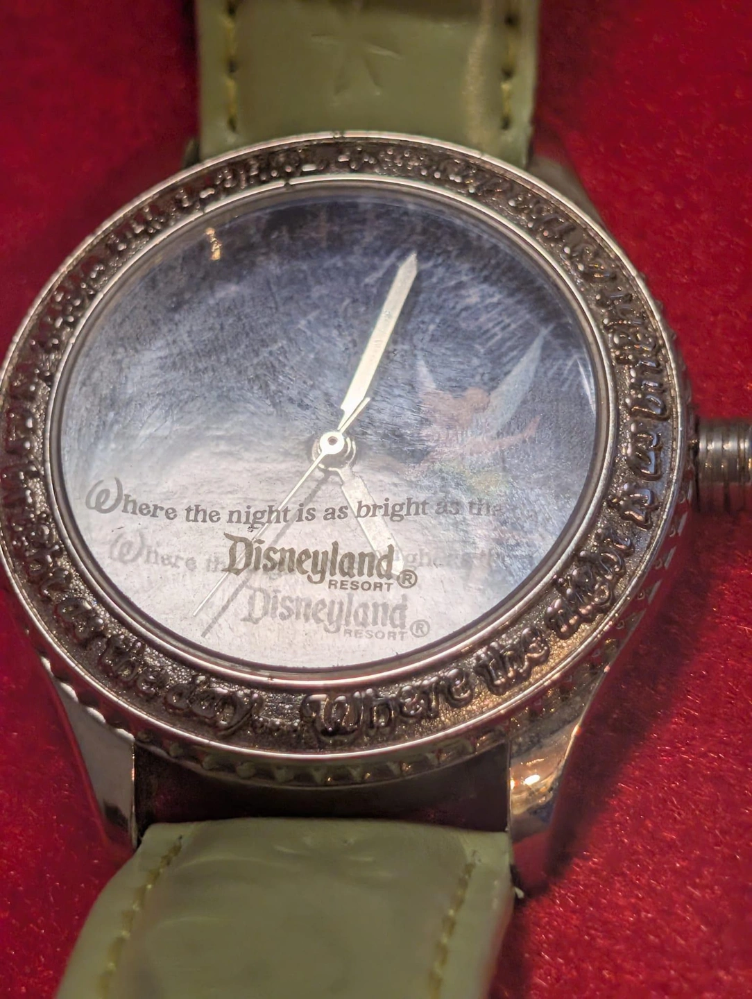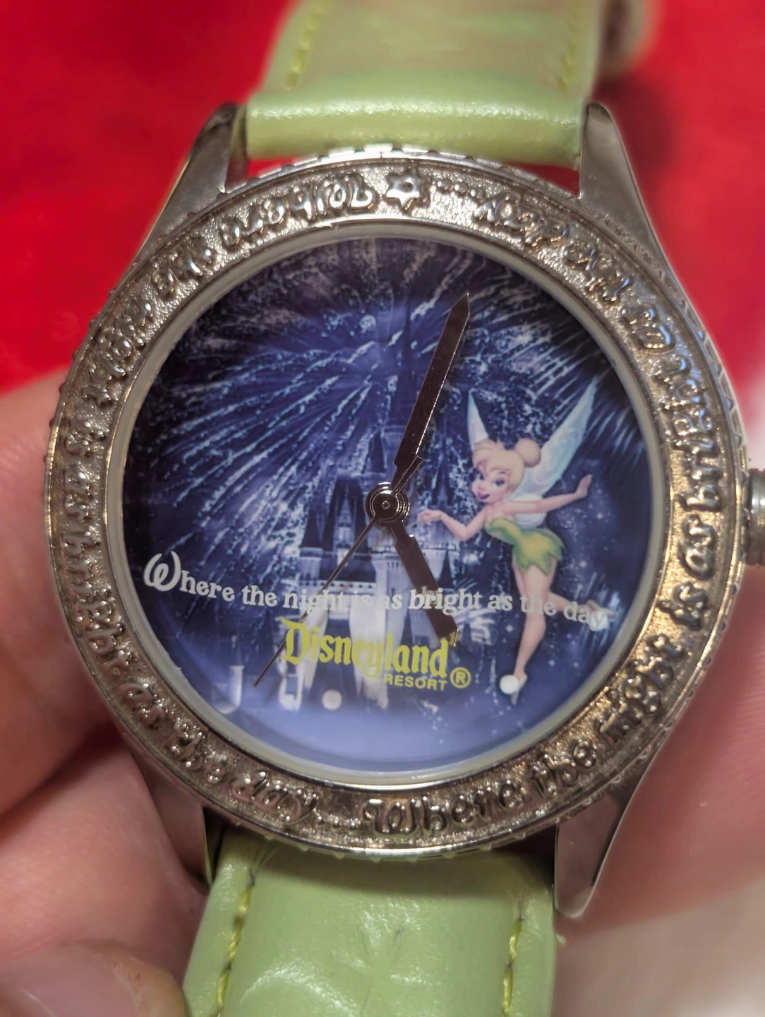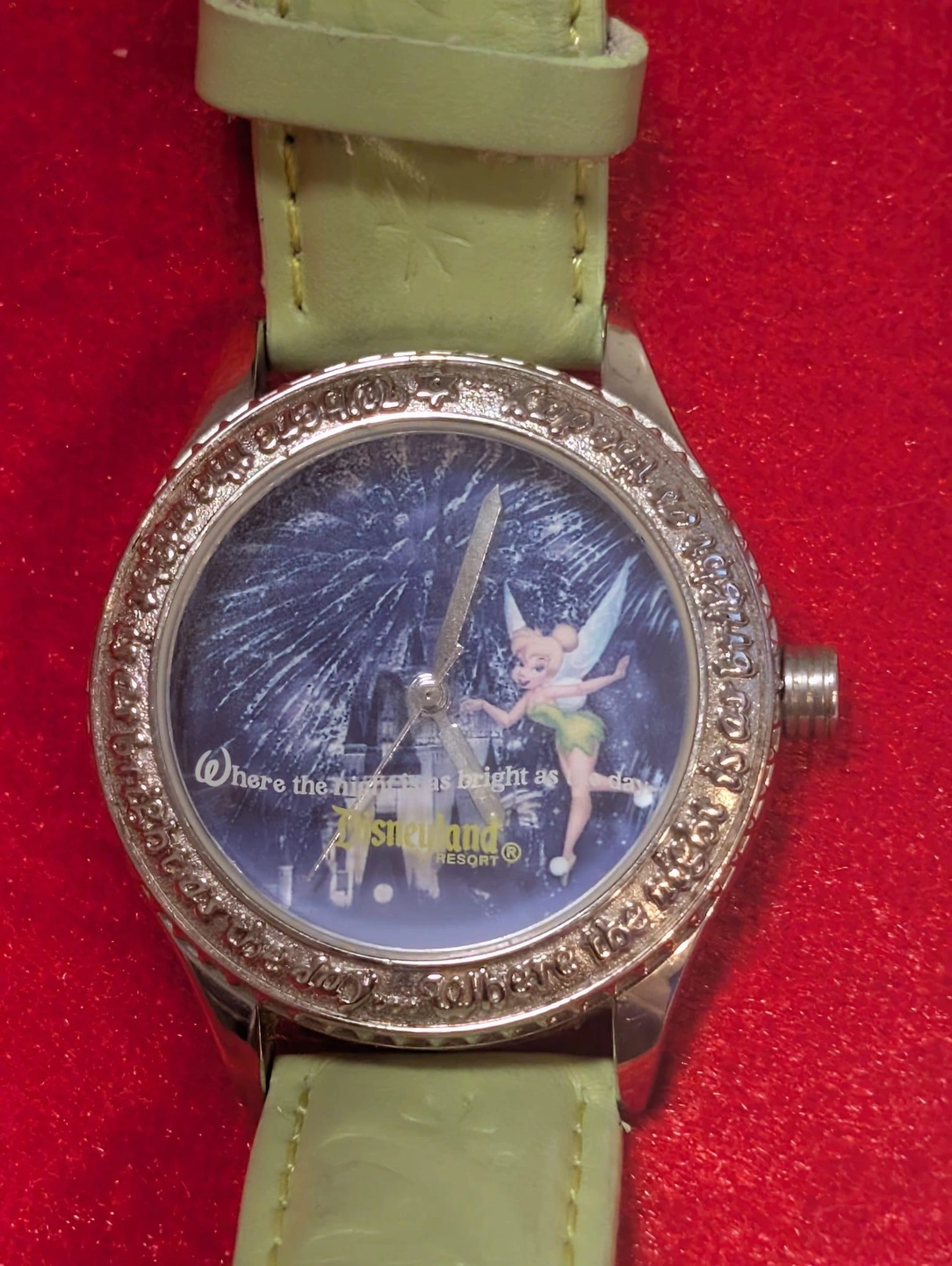 Very cute Tinker Bell watch from Disneyland. It says "Where the night is as bright as the day" around the face. Perfect for a Disney lover or collector!
