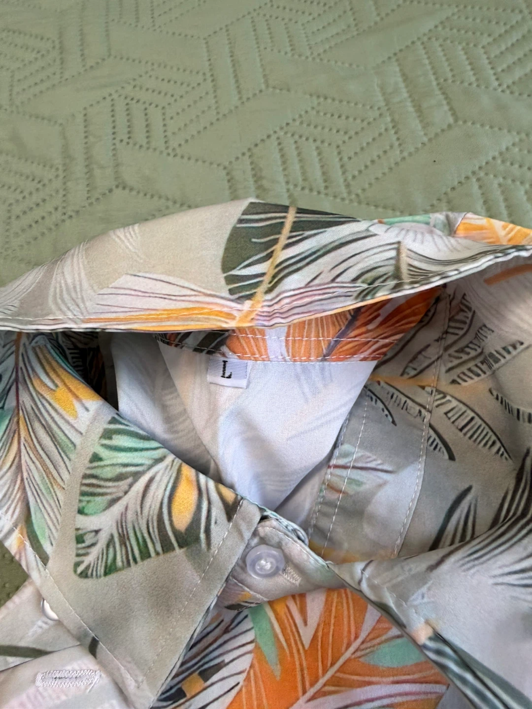 This is a men's short-sleeve button-up shirt and matching shorts set. The shirt features a tropical leaf print with shades of green, orange, and yellow. It's a size large.