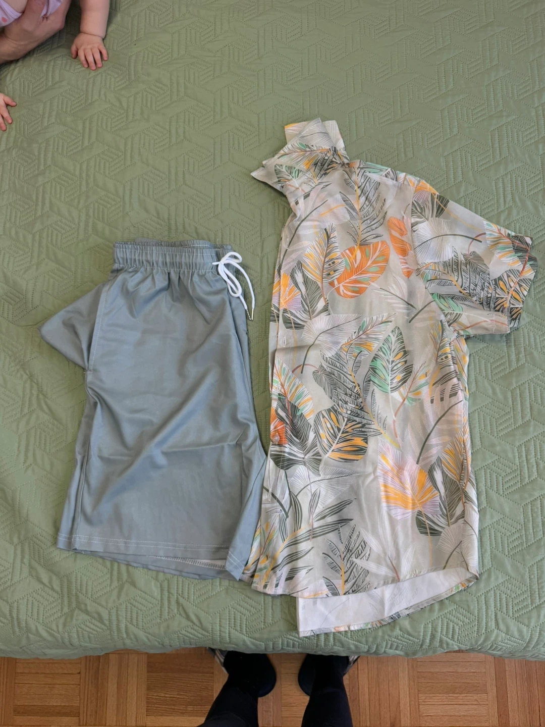 Men's Leaf Print Button-Up Shirt and Shorts Set - Size L