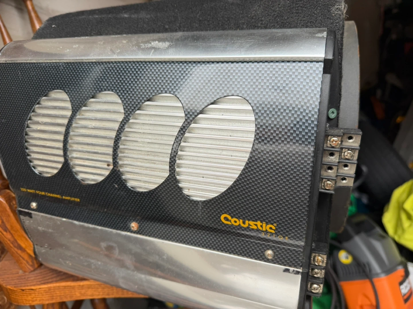 This is an Alpine Type R 10-inch car subwoofer in an enclosure, paired with a Coustic 220 Watt 4 Channel Amplifier. The subwoofer features the "R" logo. The amplifier has a carbon fiber look panel and heatsinks. It's ready for your car