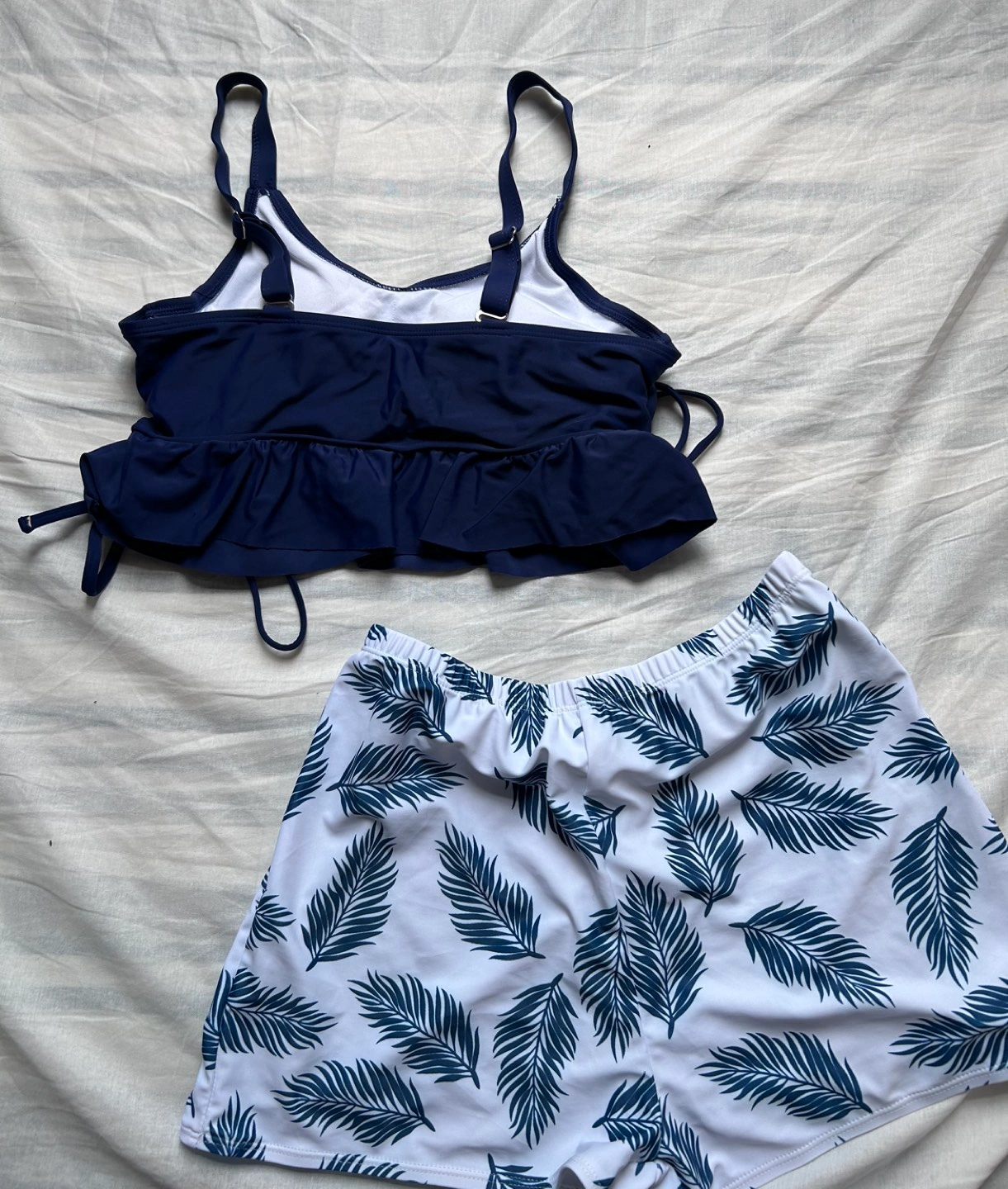 Great quality padded two piece swimsuit with short bottoms. Very secure and cute.