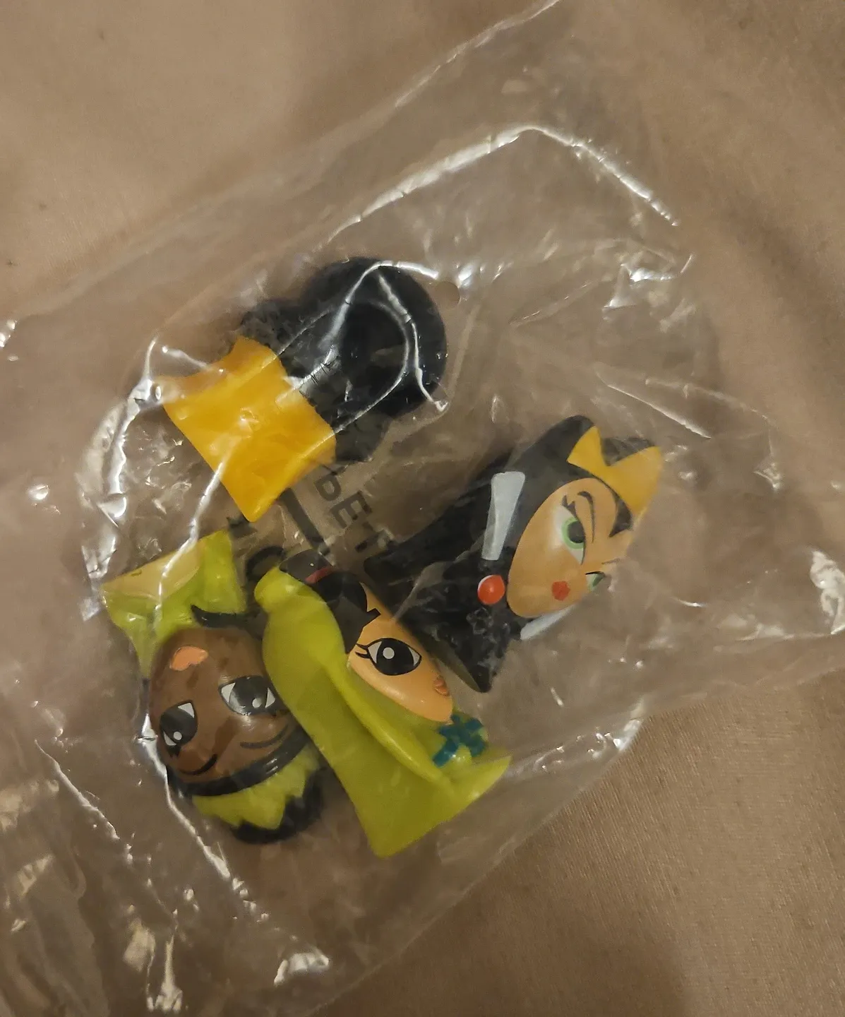 This is a bundle of four small collectible figures. They appear to be made of plastic and are in a sealed bag. The figures have a whimsical, cartoonish style.