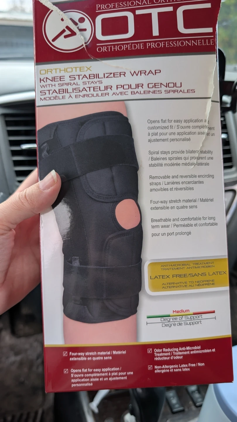 This OTC Orthotex knee stabilizer wrap is designed for support with spiral stays. It's made from four-way stretch material for comfort and breathability. The wrap features odor-reducing anti-microbial treatment and is latex-free. This is a medium size.