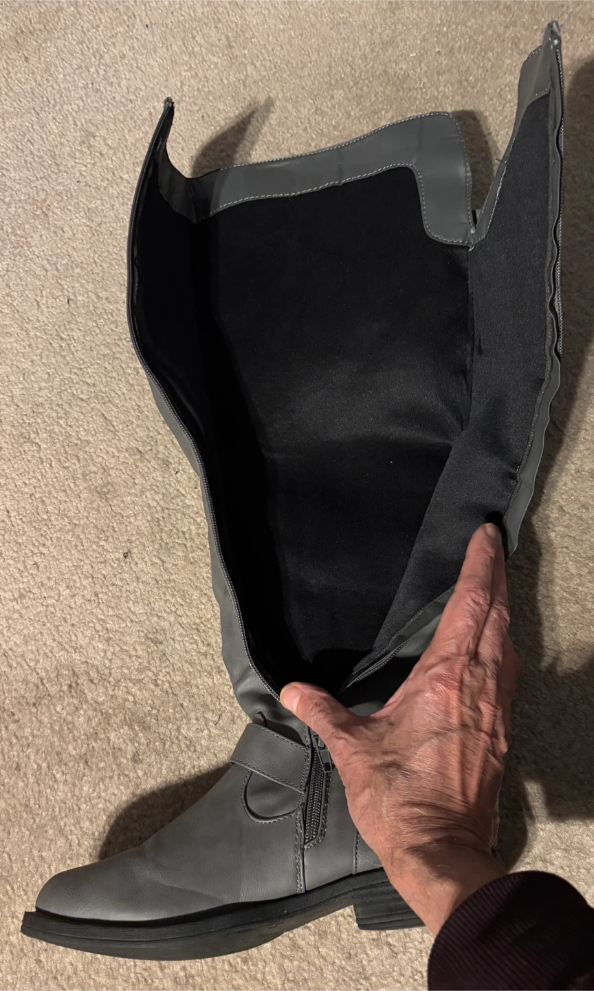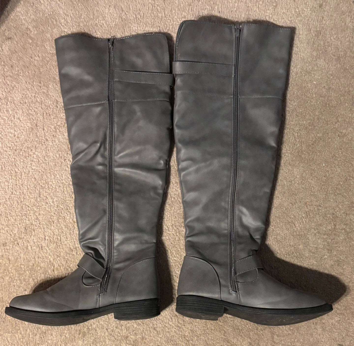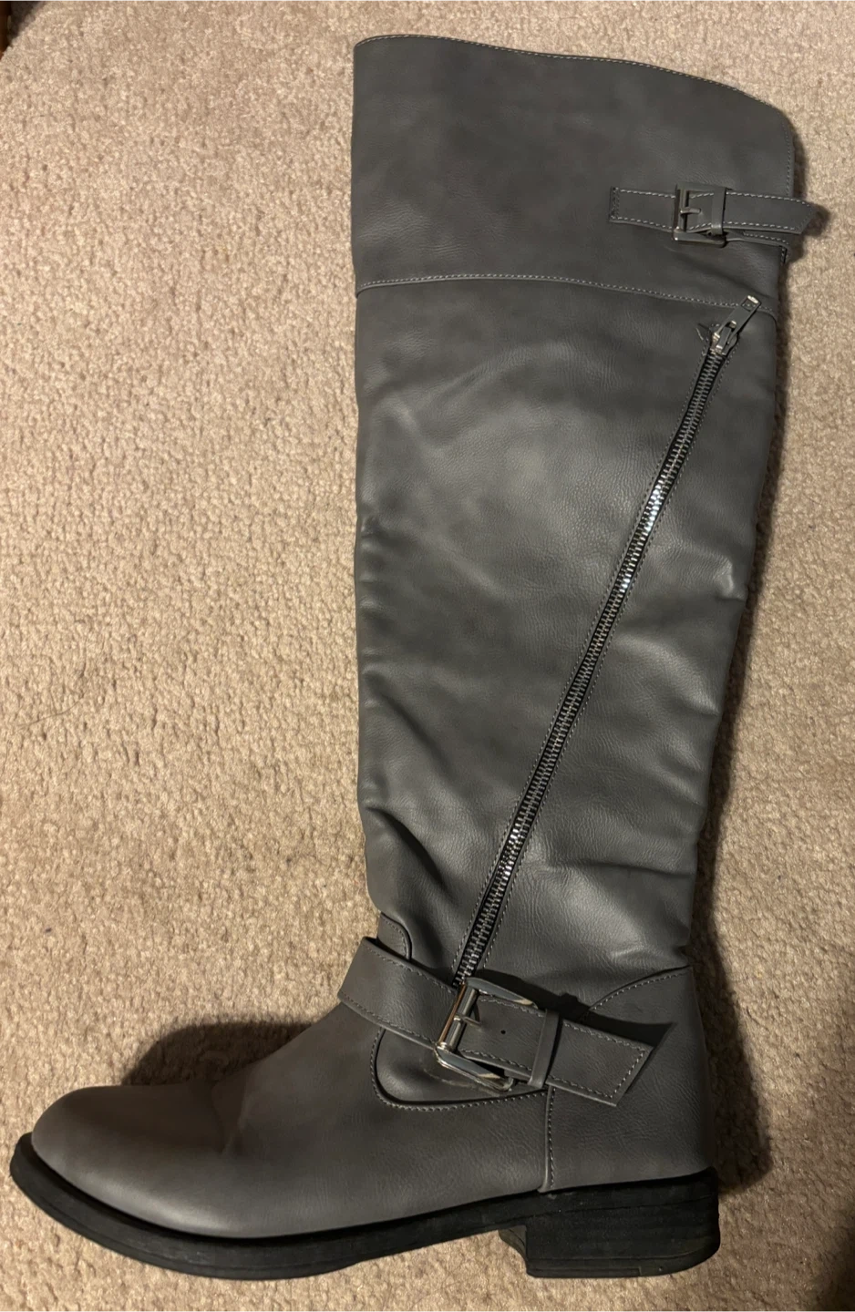 Grey knee-high boots with a side zipper and buckle detail. Faux leather material. Size 9. Length including heel 20”.