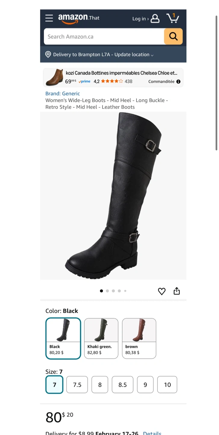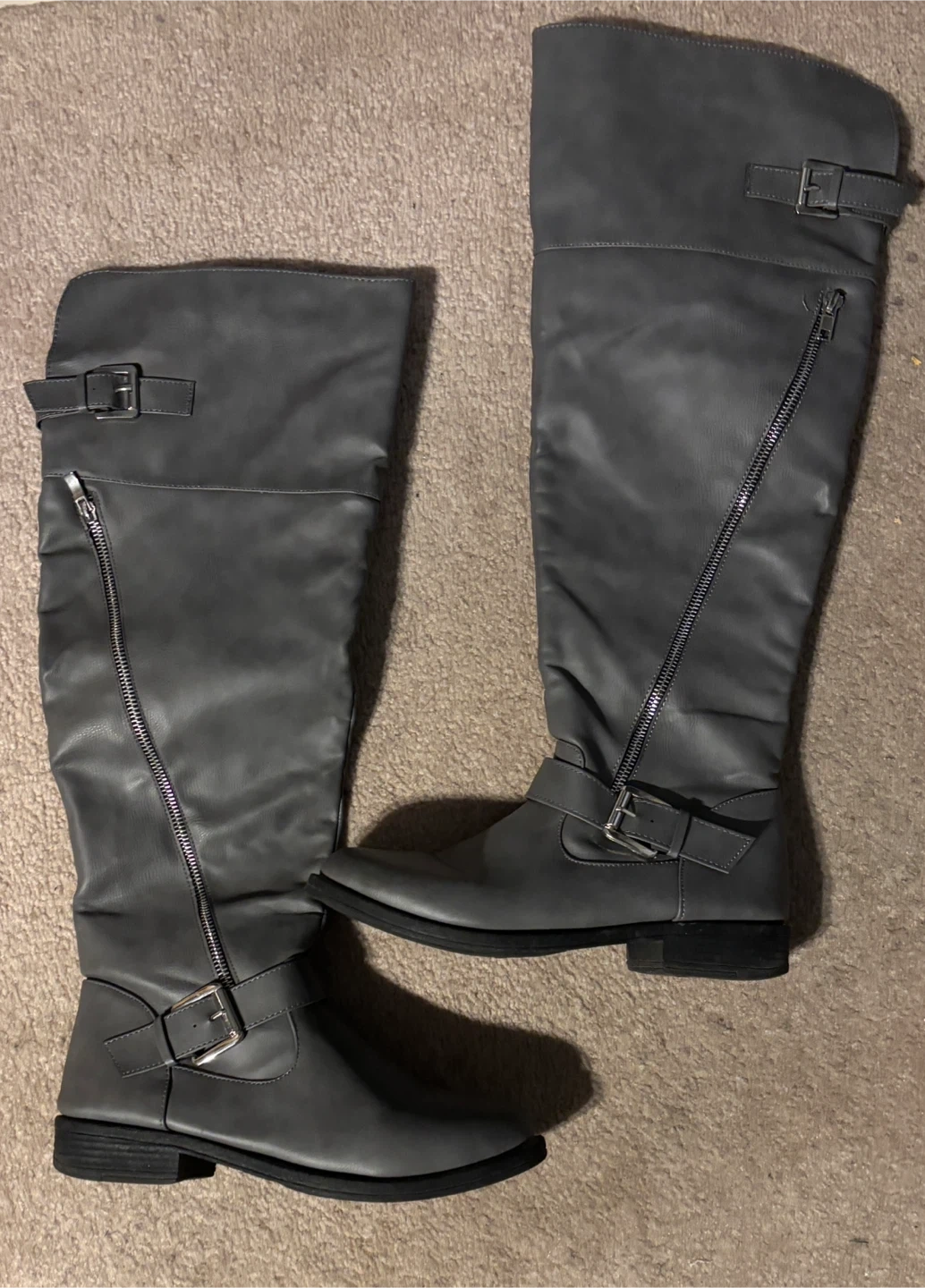 Grey knee-high boots with a side zipper and buckle detail. Faux leather material. Size 9. Length including heel 20”.