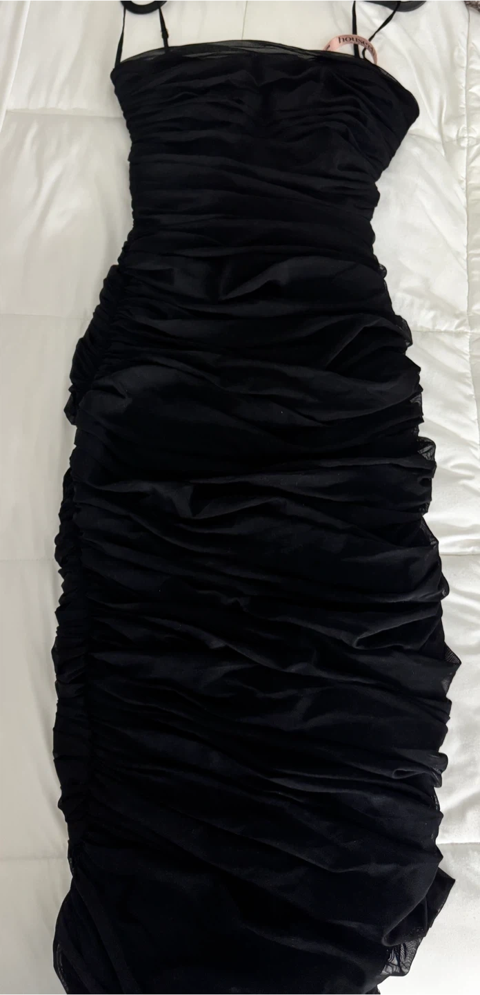 A stunning black ruched mesh dress from House of CB. It features a flattering silhouette and mid length. Perfect for a special occasion or an evening out!