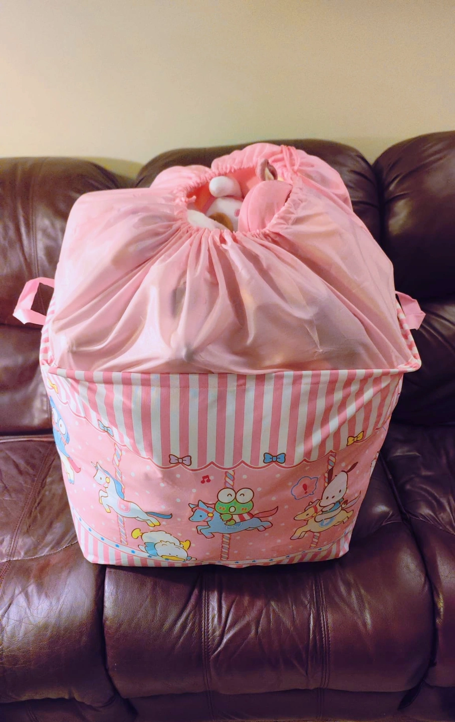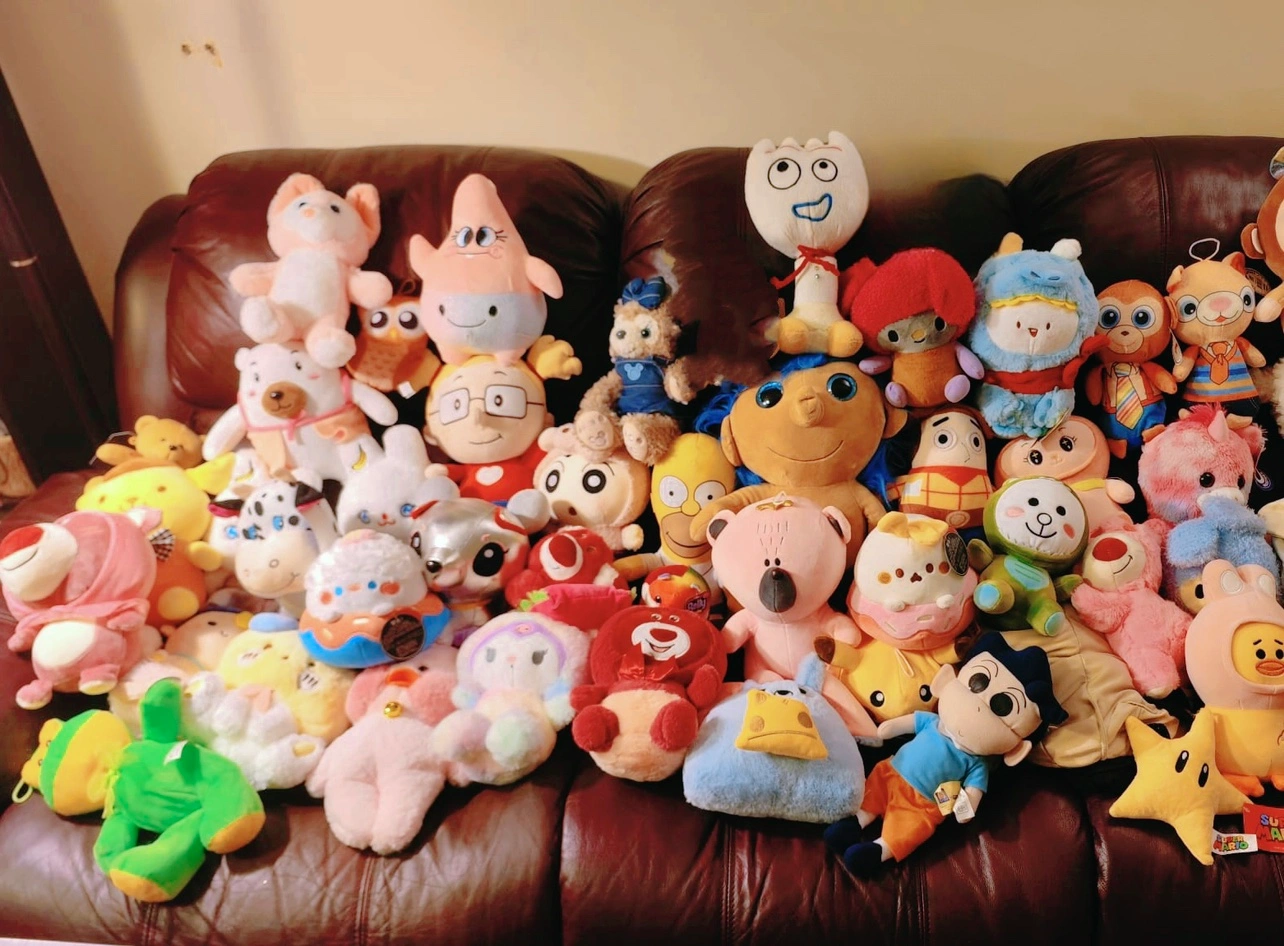 This lot includes around 50 plush toys of varying sizes and characters. They are all like new and some came with tag. The whole pack include a pink striped storage bin.