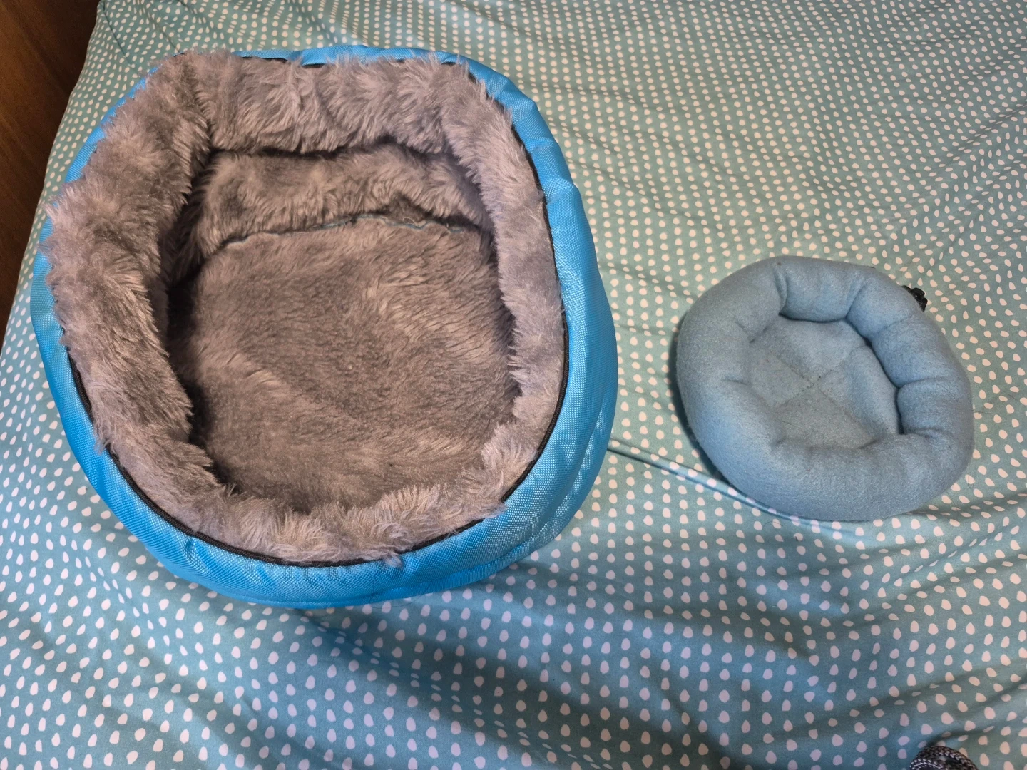 Comfortable pet bed with plush grey interior and a durable blue exterior. It's soft and cozy for your furry friend. Smaller complementary pet bed also included. Medium pet bed $10 and Smaller pet bed $5