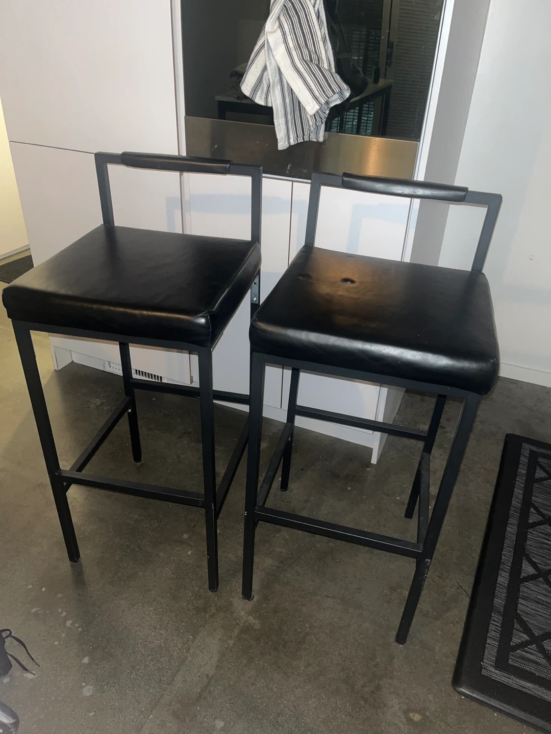 Selling a set of two bar stools. They feature a sleek black design with a padded seat for extra comfort. The sturdy metal frame ensures durability, making them perfect for your kitchen island or bar area. They show some minor wear but are still in good condition and ready to use!