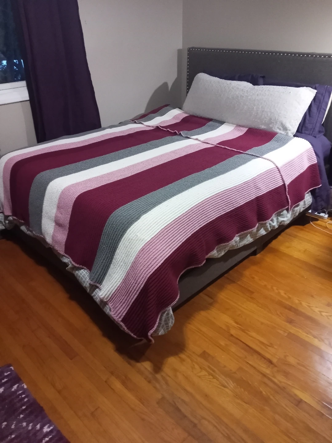 Cozy handmade crochet blanket 100% cotton with bold stripes. Colours include burgundy, grey, pink, and cream. Perfect for adding a touch of warmth and style to your bedroom.