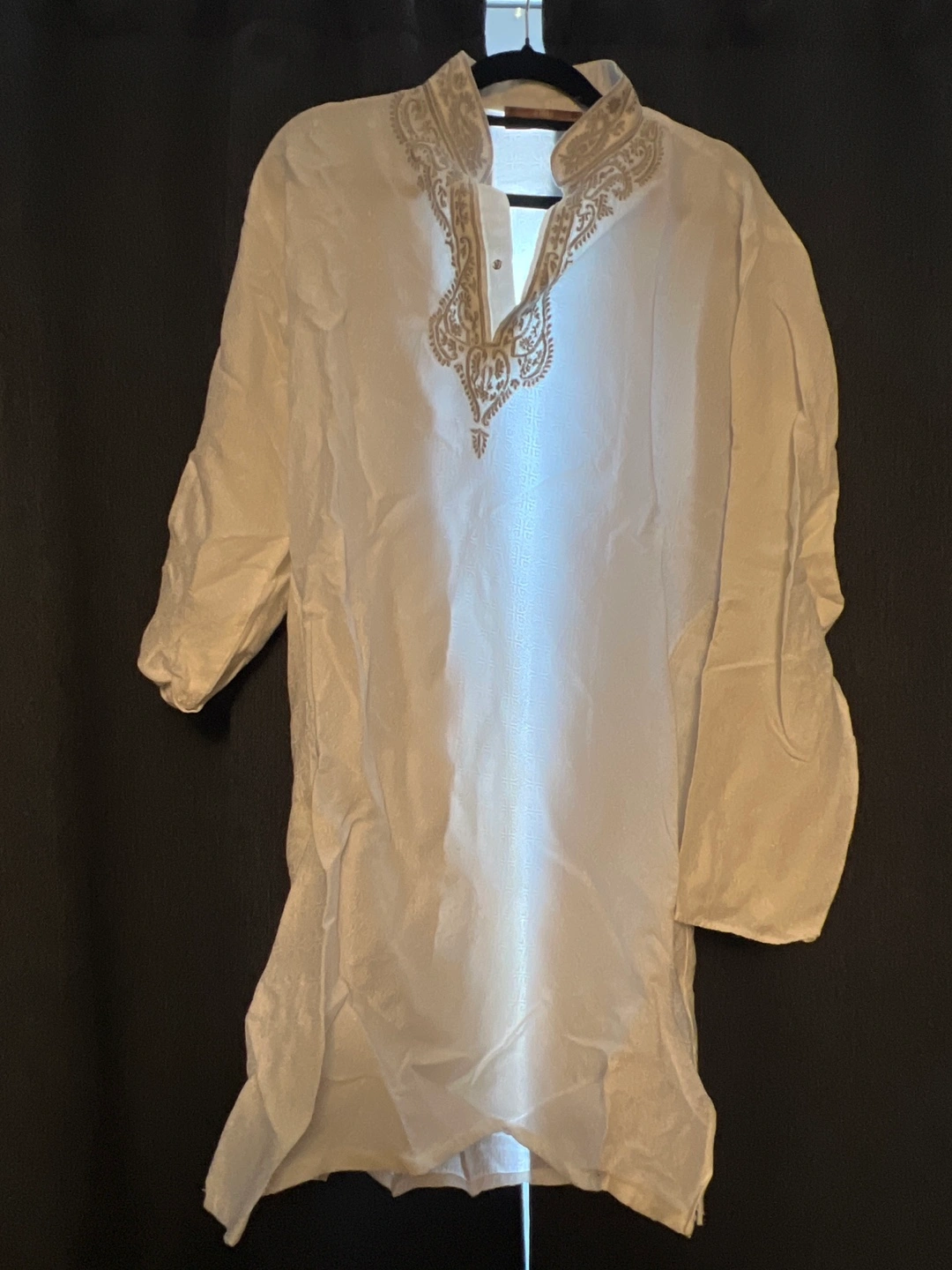 Here's a white kurta shirt. It features a mandarin collar with embroidered details. The material is lightweight, perfect for warm weather!