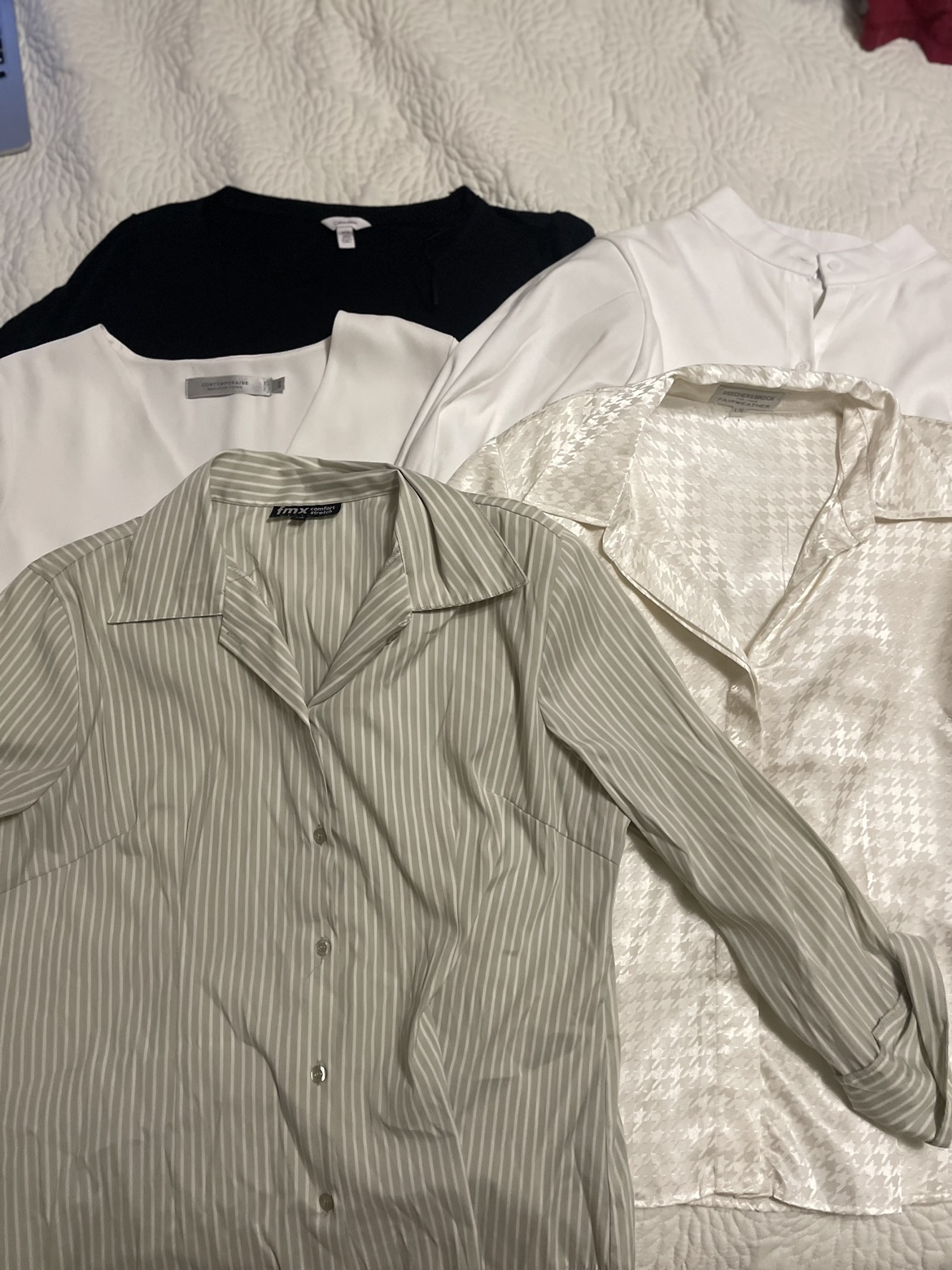 Bundle of 5 blouses. 2 blouses from Simon’s and Calvin Klein. 3 button ups, including one green striped, one white with puff sleeves and a white patterned button up.