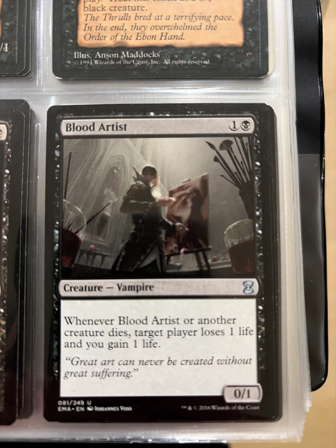 This is a Magic: The Gathering Blood Artist card. It's a Vampire creature card. When Blood Artist or another creature dies, a target player loses 1 life and you gain 1 life. Never played. Mint condition.
