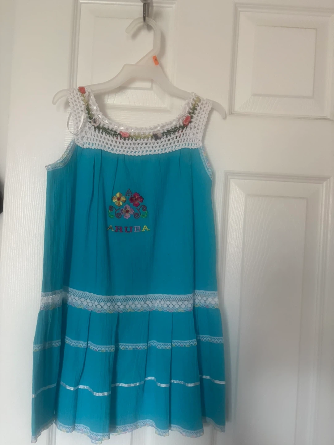 Turquoise dress with white crochet neckline and embroidered floral accents. Features 'ARUBA' text embroidered on the chest. Pleated skirt with decorative ribbon details. Perfect for casual wear or beach days!