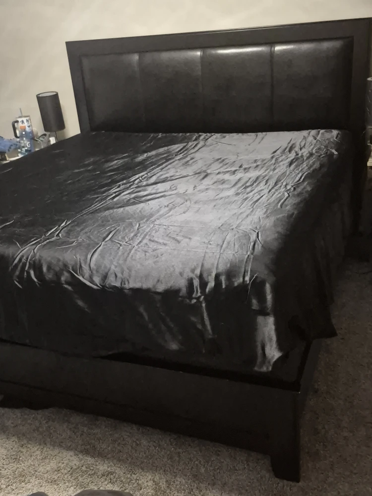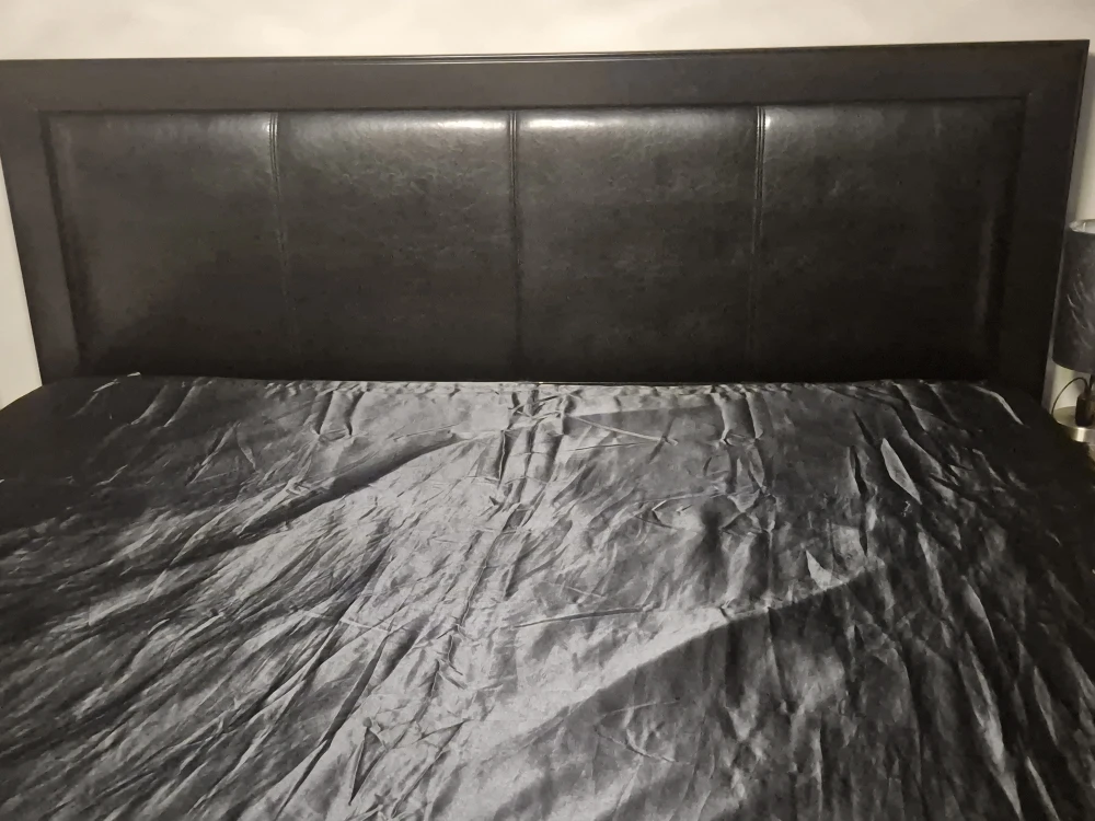 Black king size bed frame and headboard in good condition! It's a stylish addition to any bedroom. The headboard is made from sturdy materials and has a sleek design. Perfect for creating a cozy and inviting space