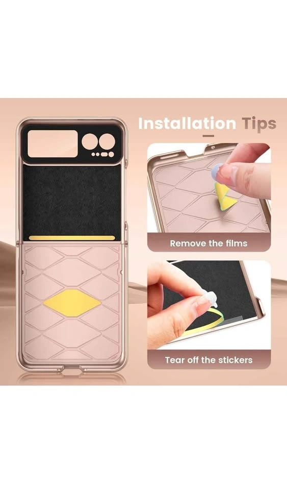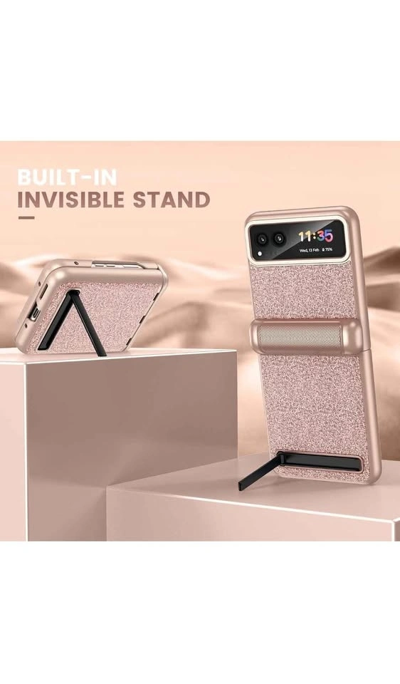 This is a VEGO case for the Motorola Razr 2023. It features hinge protection, a built-in kickstand, and an ultra-HD camera screen protector. The color is Rose Pink and it has a sparkly, glittery design, making it a cute and slim cover for women.