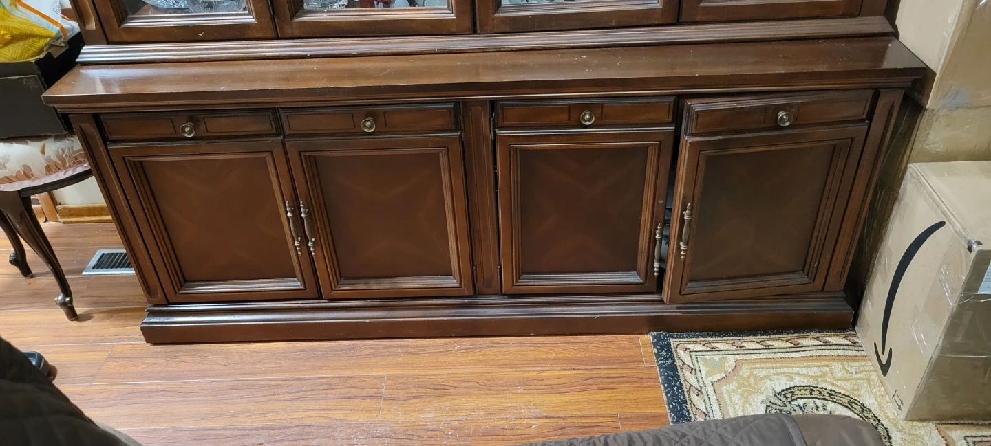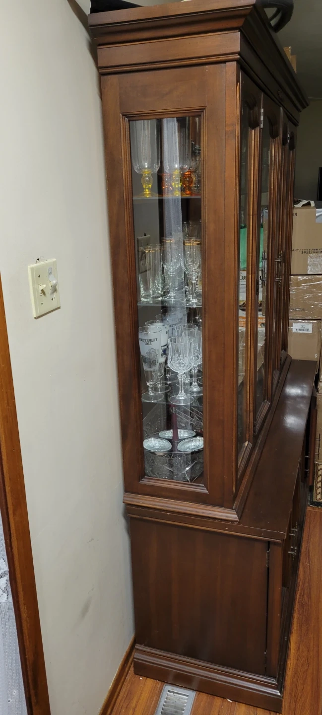 Selling a dark brown china cabinet. It has glass doors on top and wooden doors on the bottom. Great for displaying your favourite dishes and glassware! Will include all crystal and glassware if you want for a little bit extra?.