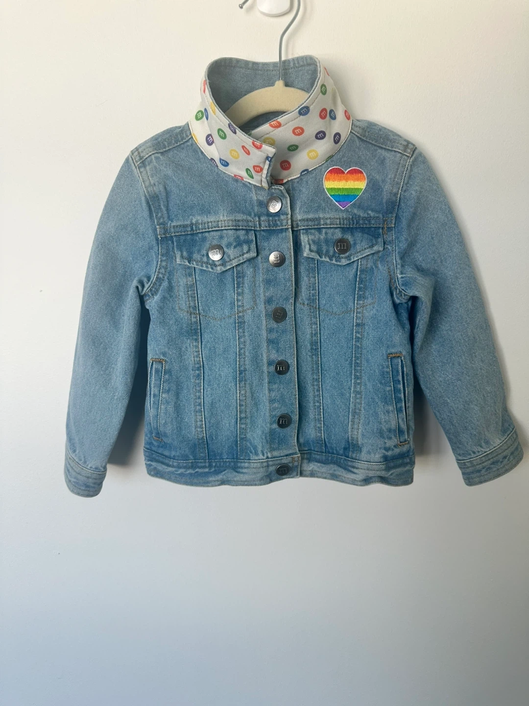 This cute denim jacket features a rainbow heart patch on the front and a sequined rainbow with clouds and M&M's on the back. The inside collar has a fun M&M print. It's a great way for kids to show off their personality!