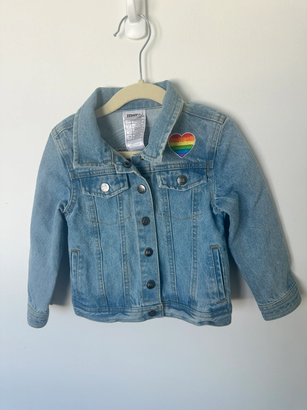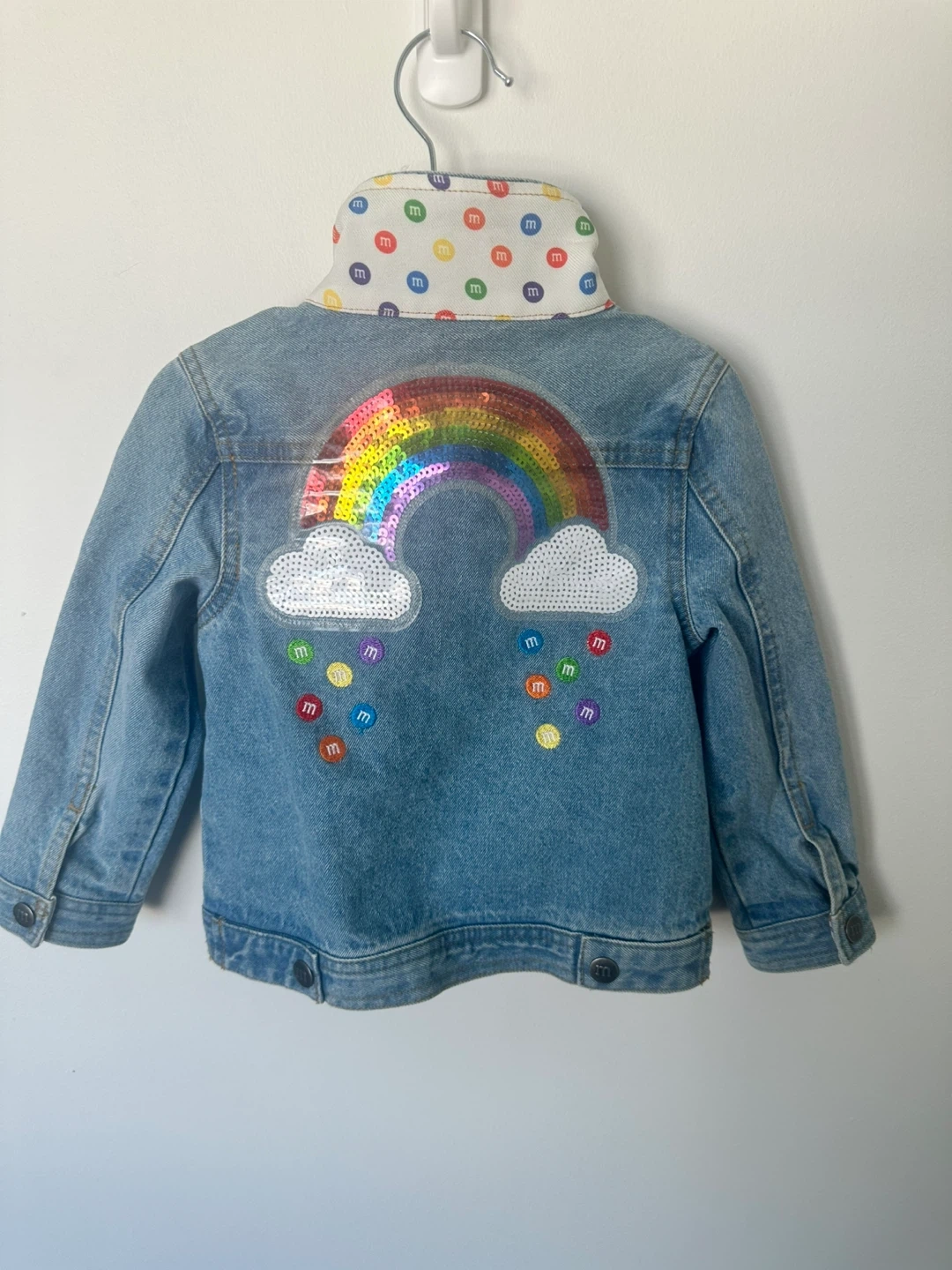 This cute denim jacket features a rainbow heart patch on the front and a sequined rainbow with clouds and M&M's on the back. The inside collar has a fun M&M print. It's a great way for kids to show off their personality!