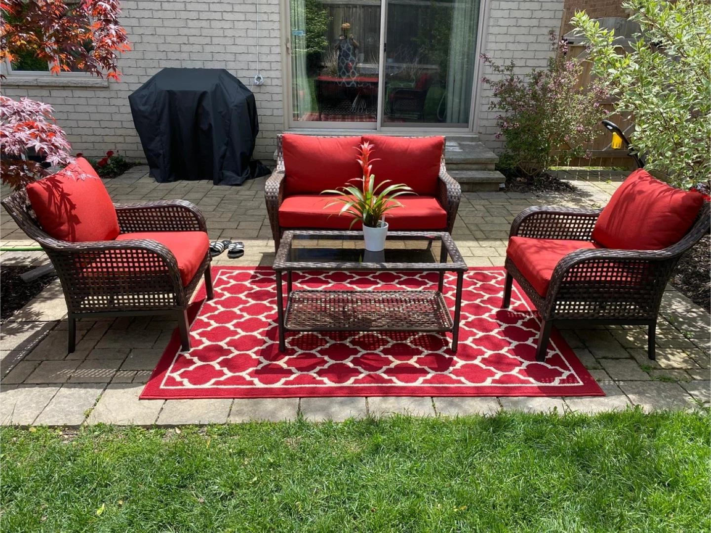 Gently used 4-piece patio furniture set in very good condition. Comfortable and perfect for a patio, deck, or backyard.
