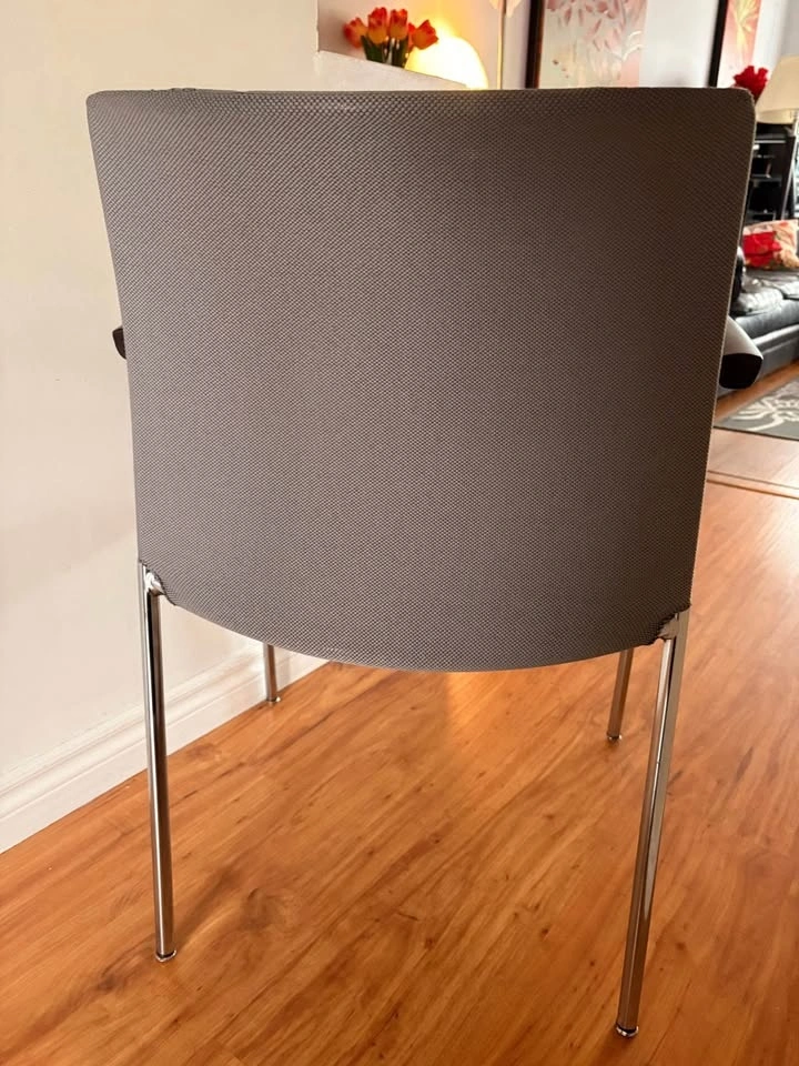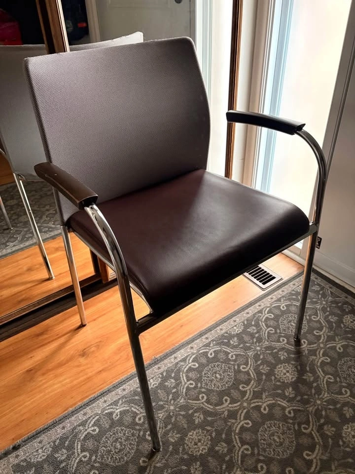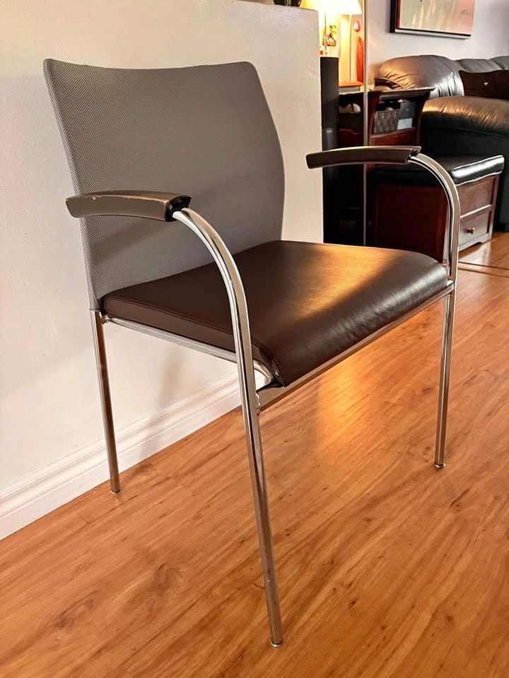 Chrome frame. Brown leather seat & Grey fabric. These are classics and very comfortable. Reduced to $50, FIRM. Pickup only in Burlington. (Pinedale)