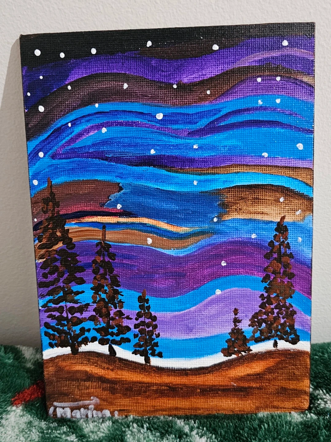 Hand-painted acrylic on canvas panel. Art featuring the aurora borealis over a snowy forest. Artwork depicts vibrant blues, purples, and browns with white stars.