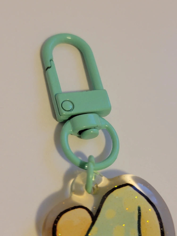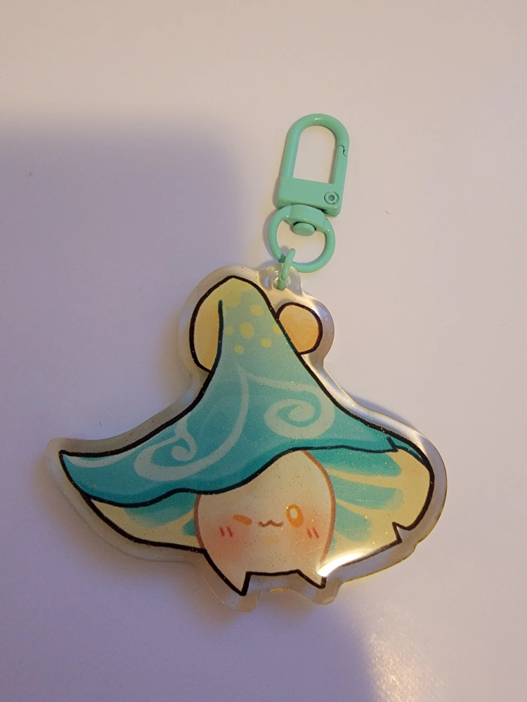 Selling a super cute keychain featuring a mushroom character with a sweet little face! It has a light blue/green mushroom cap and a matching light blue/green clip.