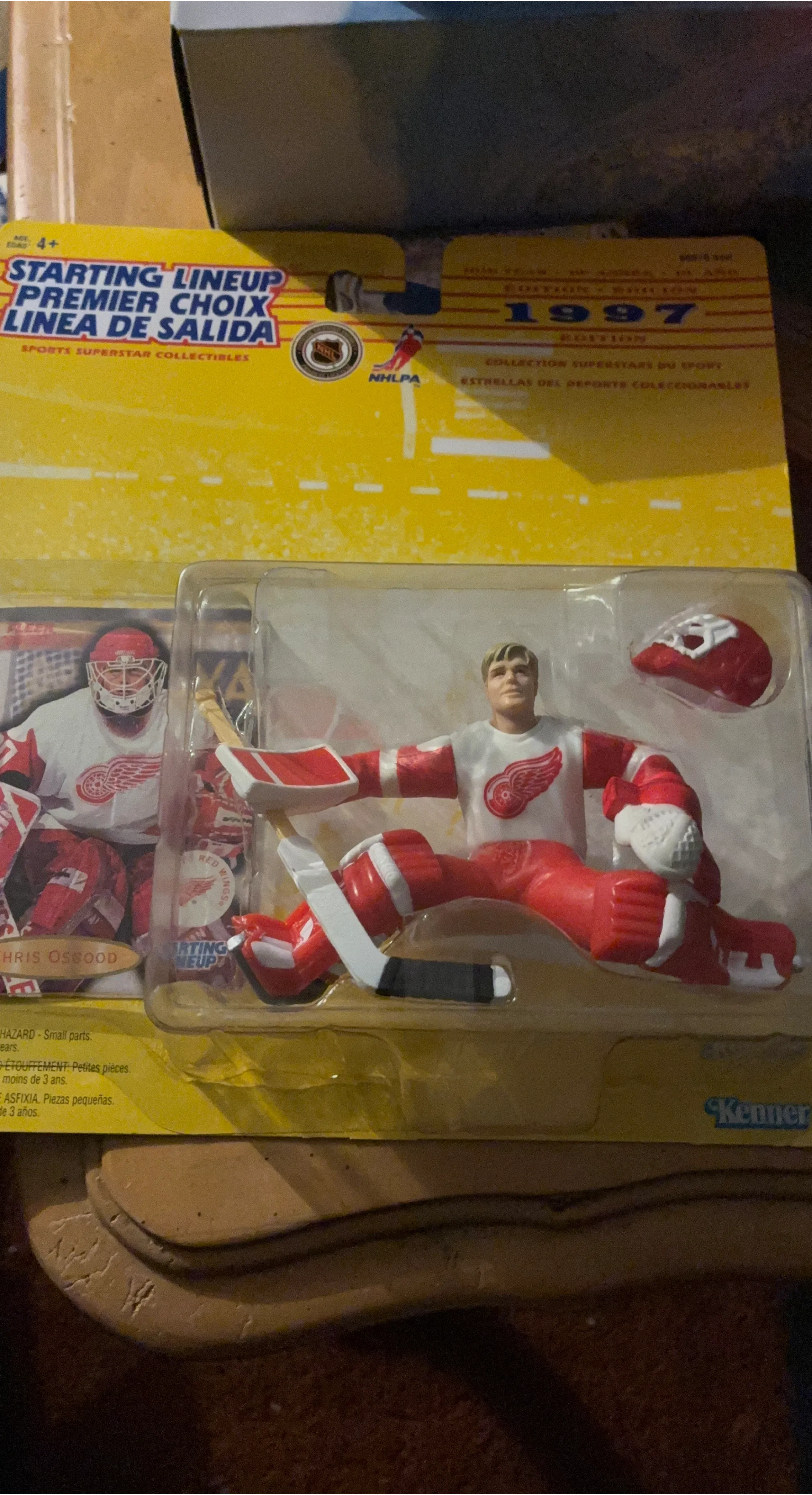 This is a 1997 Starting Lineup action figure featuring NHL star Chris Osgood. It's part of the Sports Superstar Collectibles line. The package includes the action figure, a helmet, and a hockey stick.