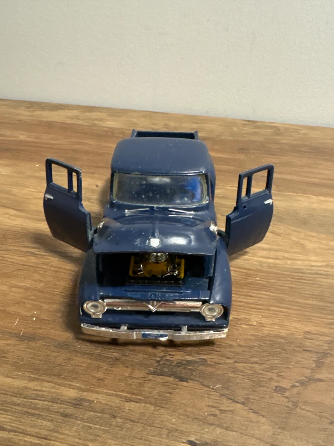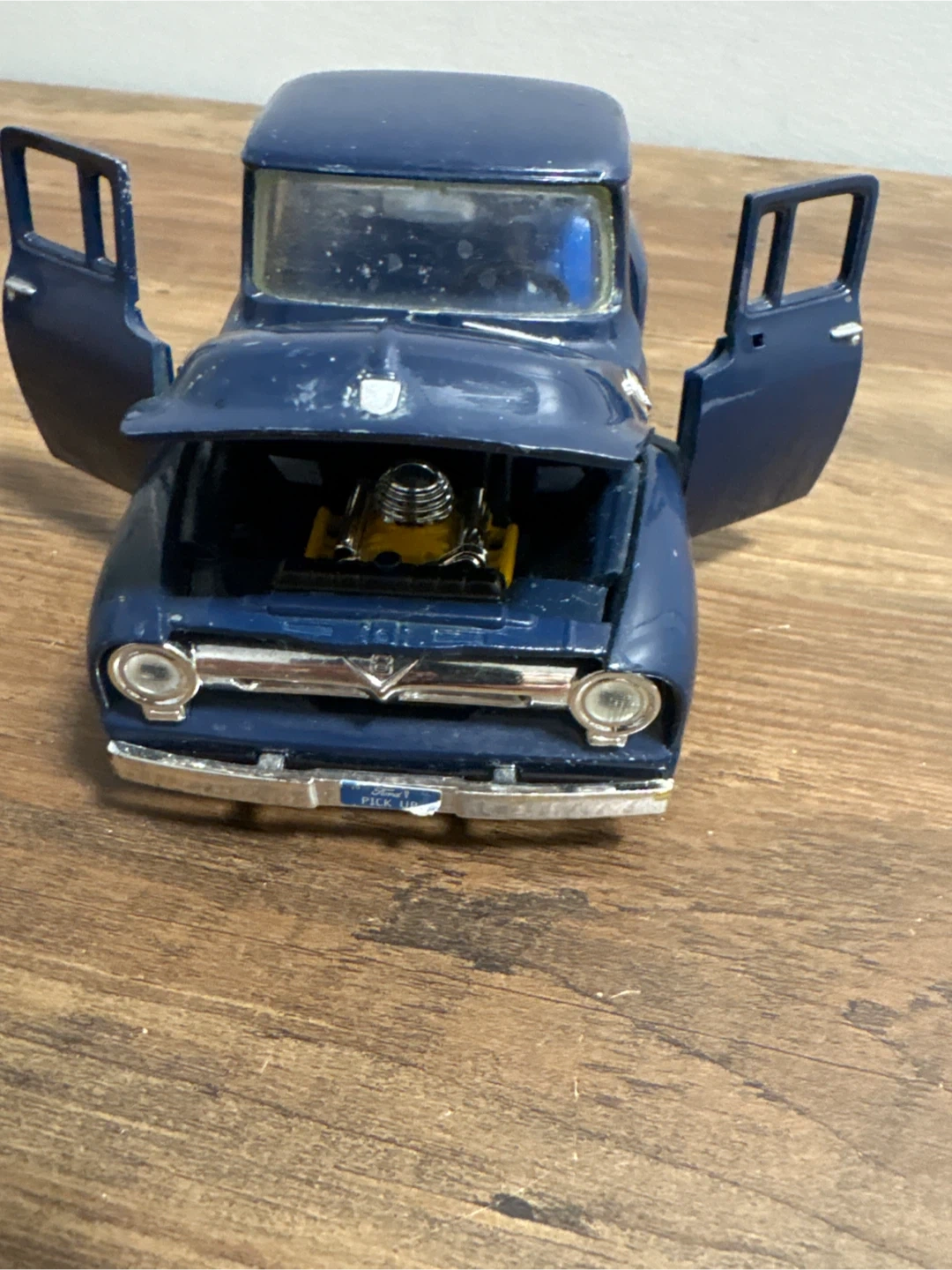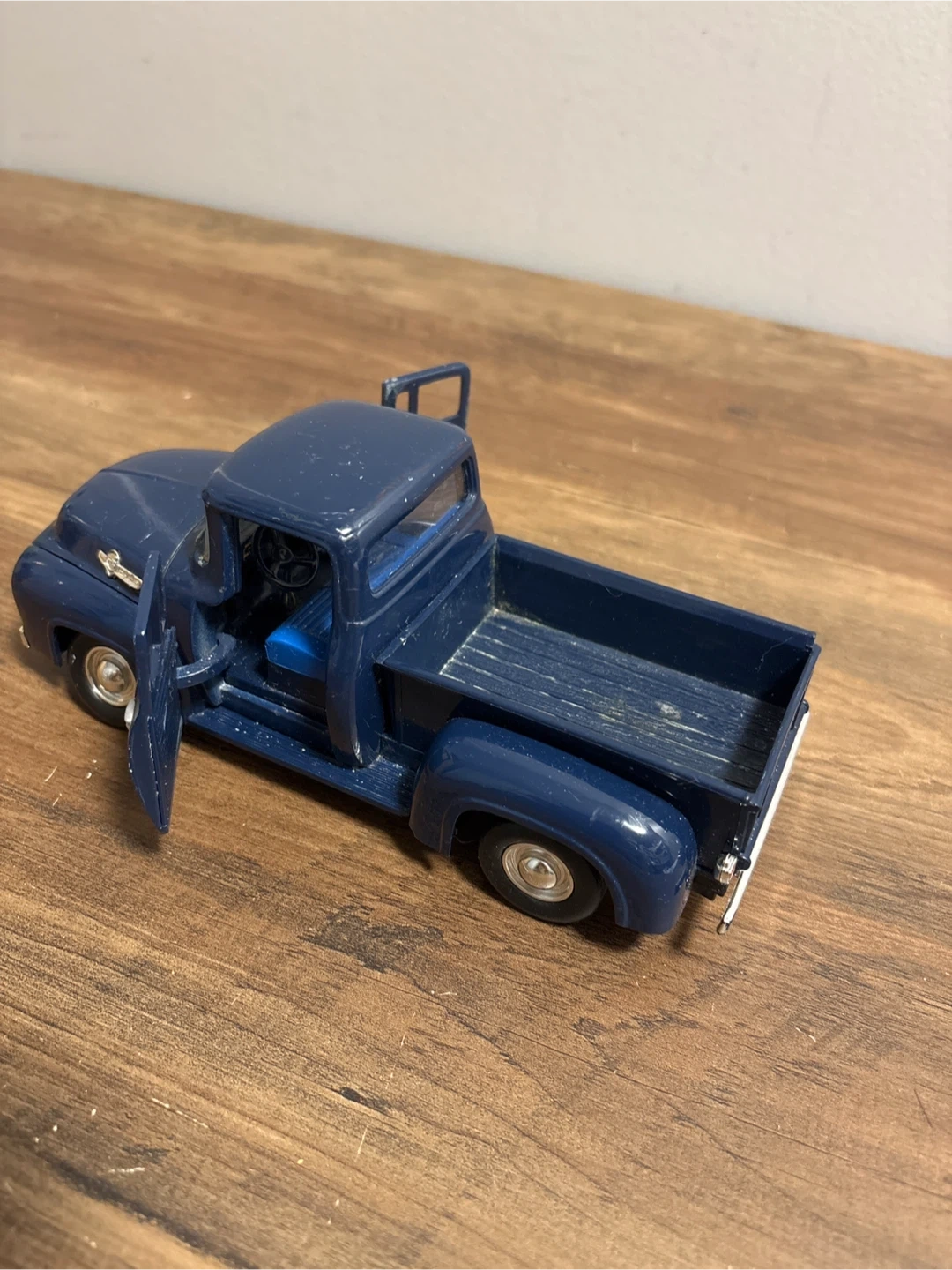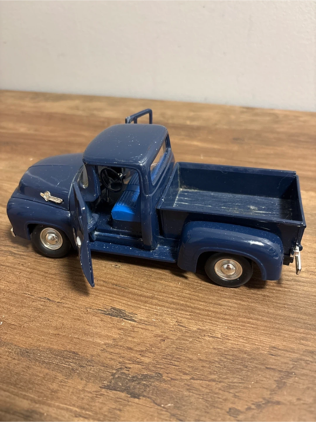 Selling a diecast model of a Ford F-100 pickup truck. It's a nice blue colour and appears to be in good condition. The doors and hood open, showing the engine and interior details