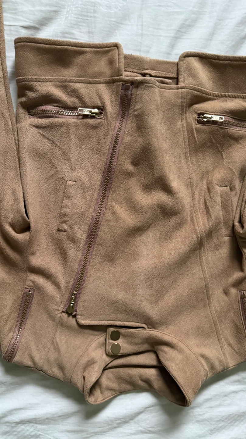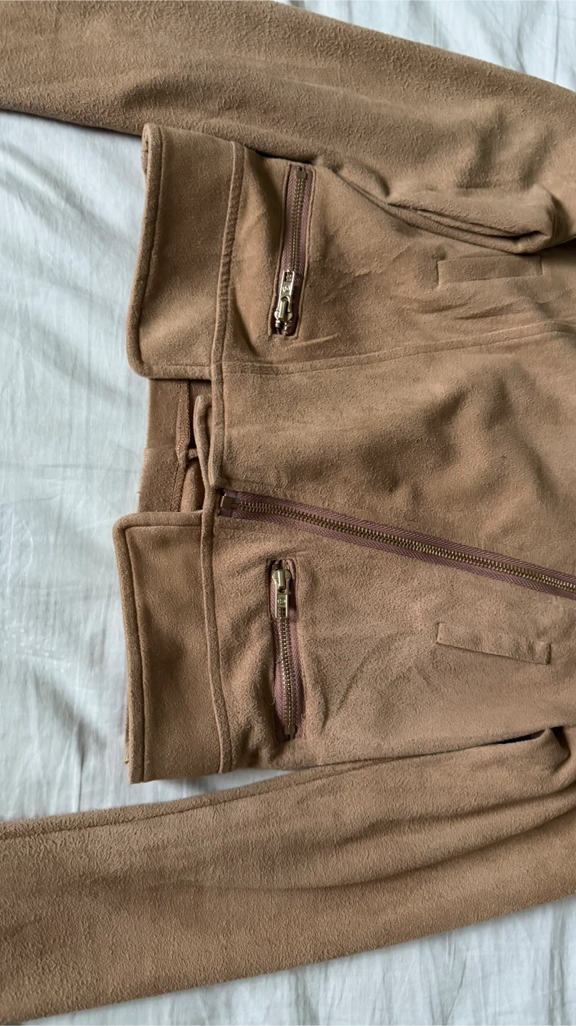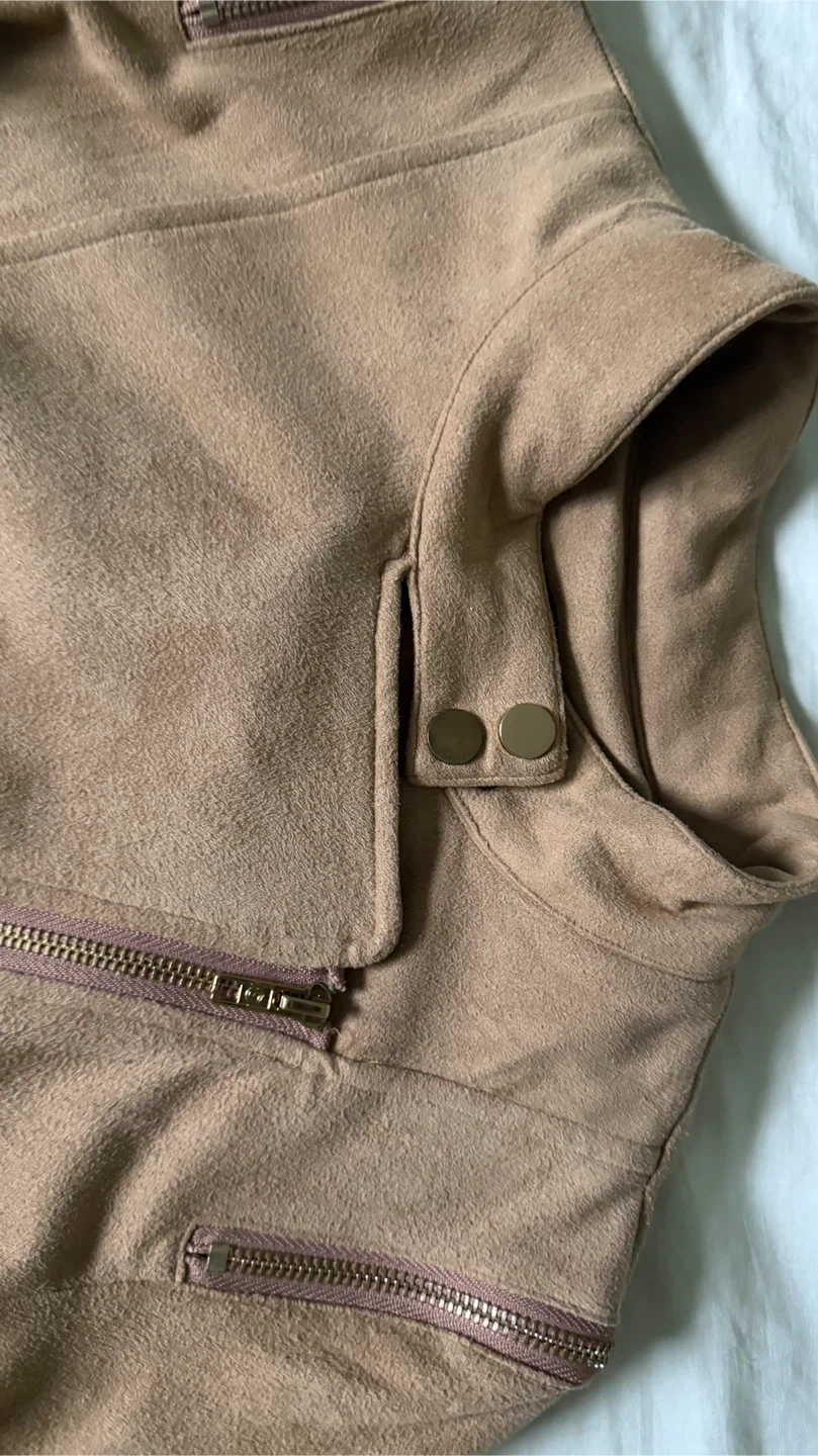 Selling a tan, suede-like moto jacket! It features an asymmetrical zipper closure and zippered pockets. Perfect for adding a bit of edge to any outfit!