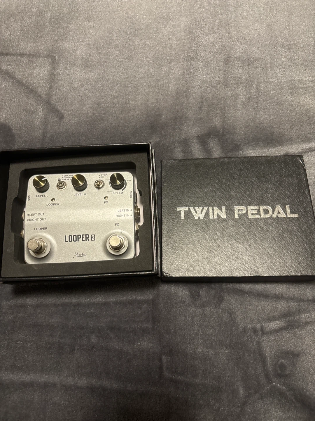 This Rowin looper 3 pedal is in good condition and comes with its original box. It's a versatile tool for guitarists looking to layer sounds. Includes USB power input.