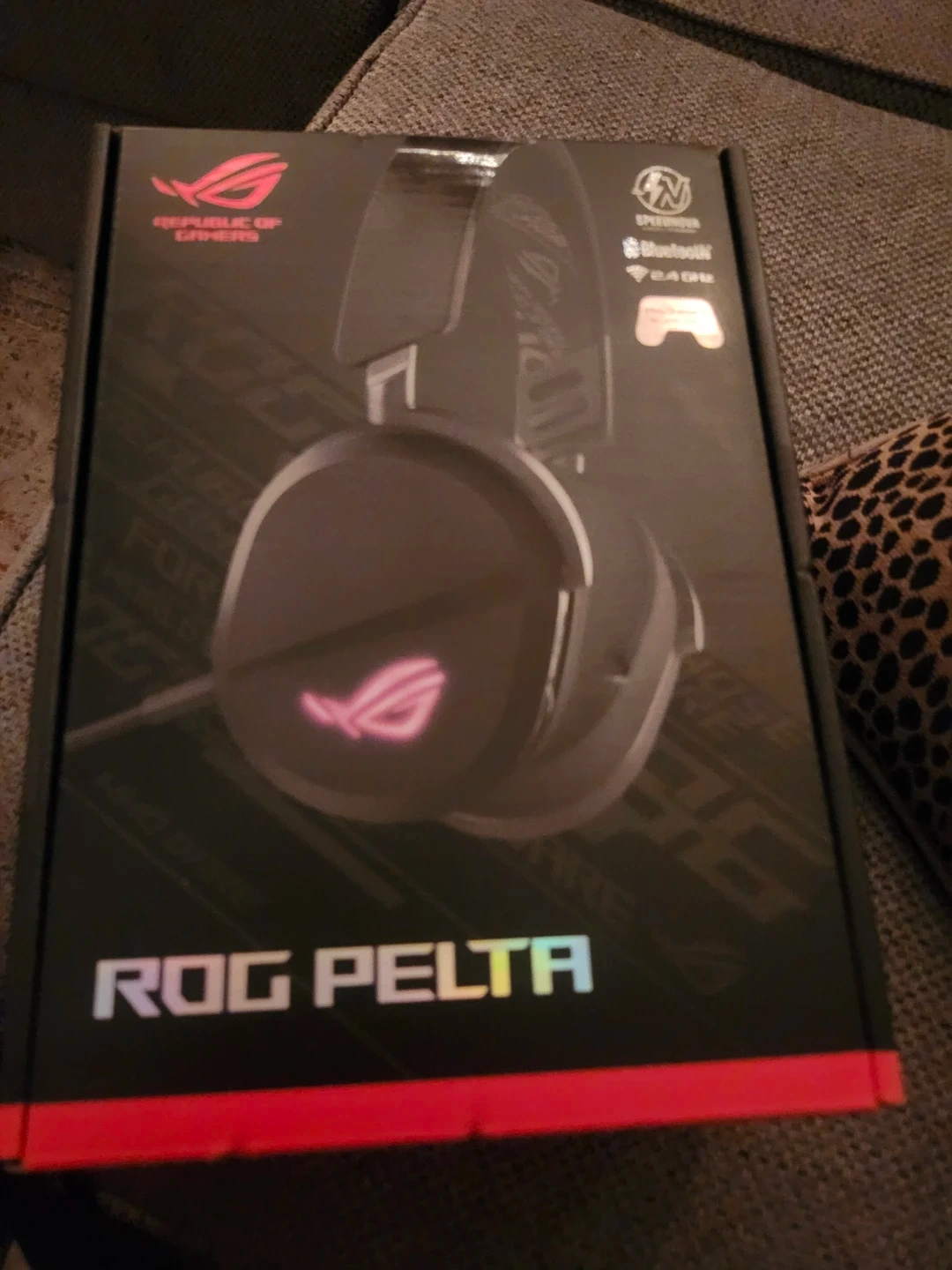 This is the ASUS ROG Pelta gaming headset. It features Bluetooth and 2.4GHz wireless connectivity. The headset is designed for gamers seeking a wireless audio experience.
