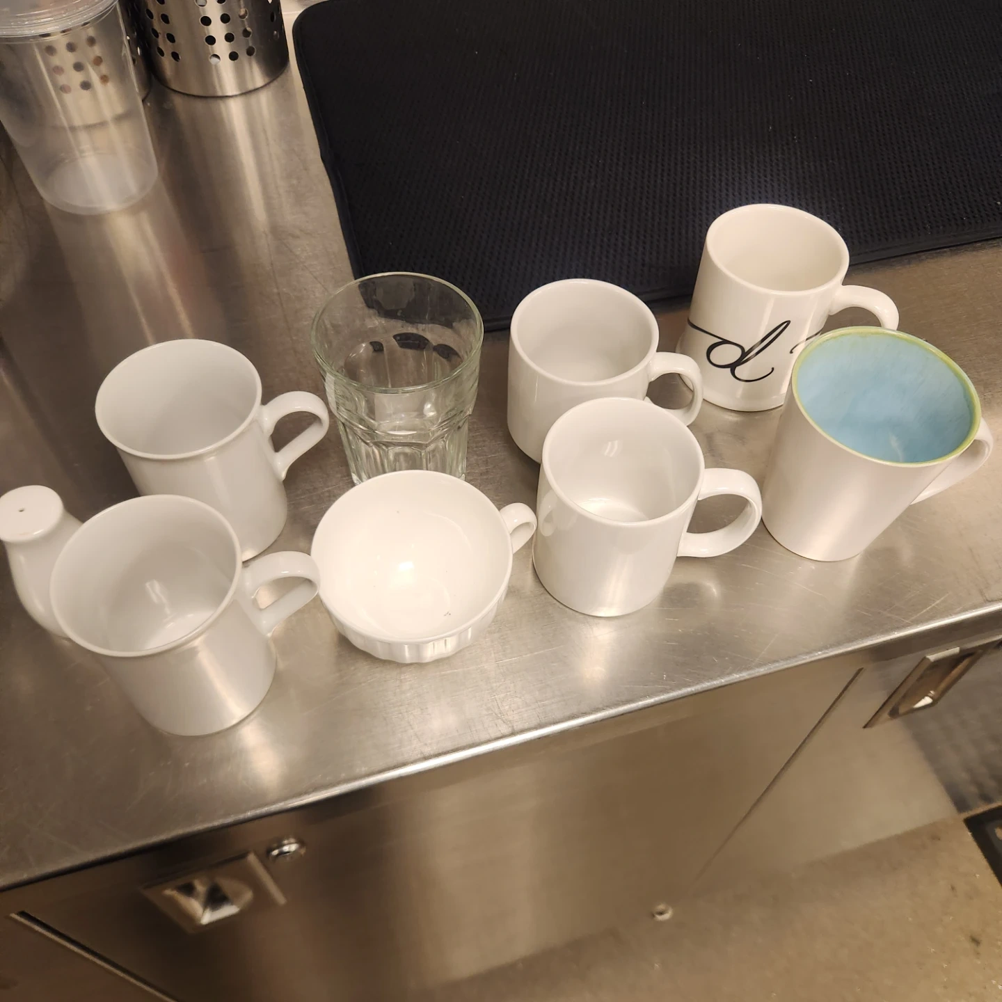 Set includes white ceramic mugs and one glass. One mug has a blue interior. Also includes a salt shaker.