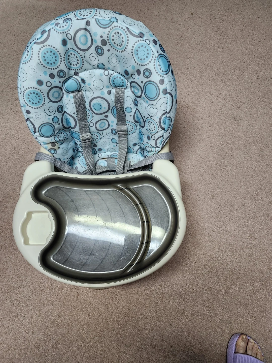 This is a baby high chair with a comfortable padded seat. It has a durable plastic frame and a removable tray insert for easy cleaning. Safety straps are included for secure seating. This chair is suitable for feeding babies and toddlers.