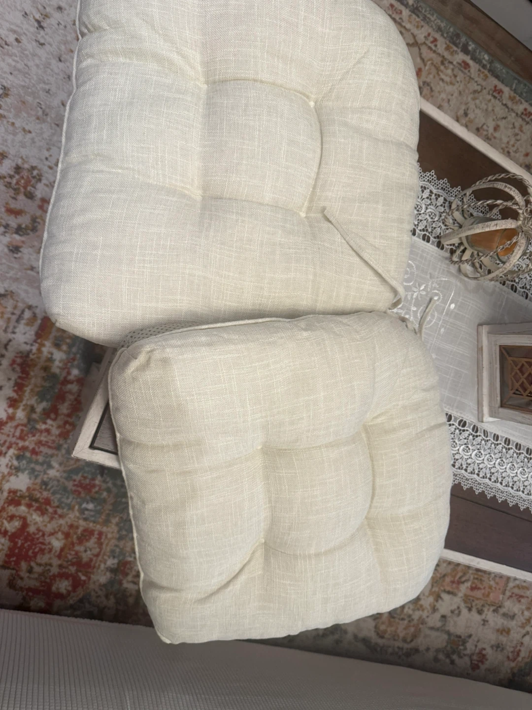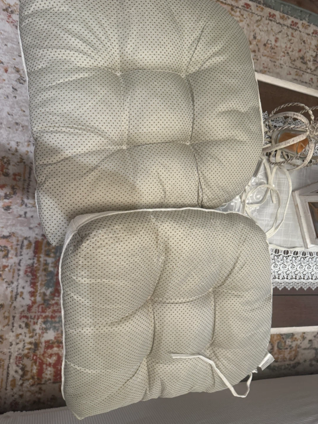 36Selling a set of two chair cushions. They are in good condition and would be perfect for adding some extra comfort to your dining or kitchen chairs! They are a neutral colour and will match any decor and the back is anti slip. 18 inch chair.