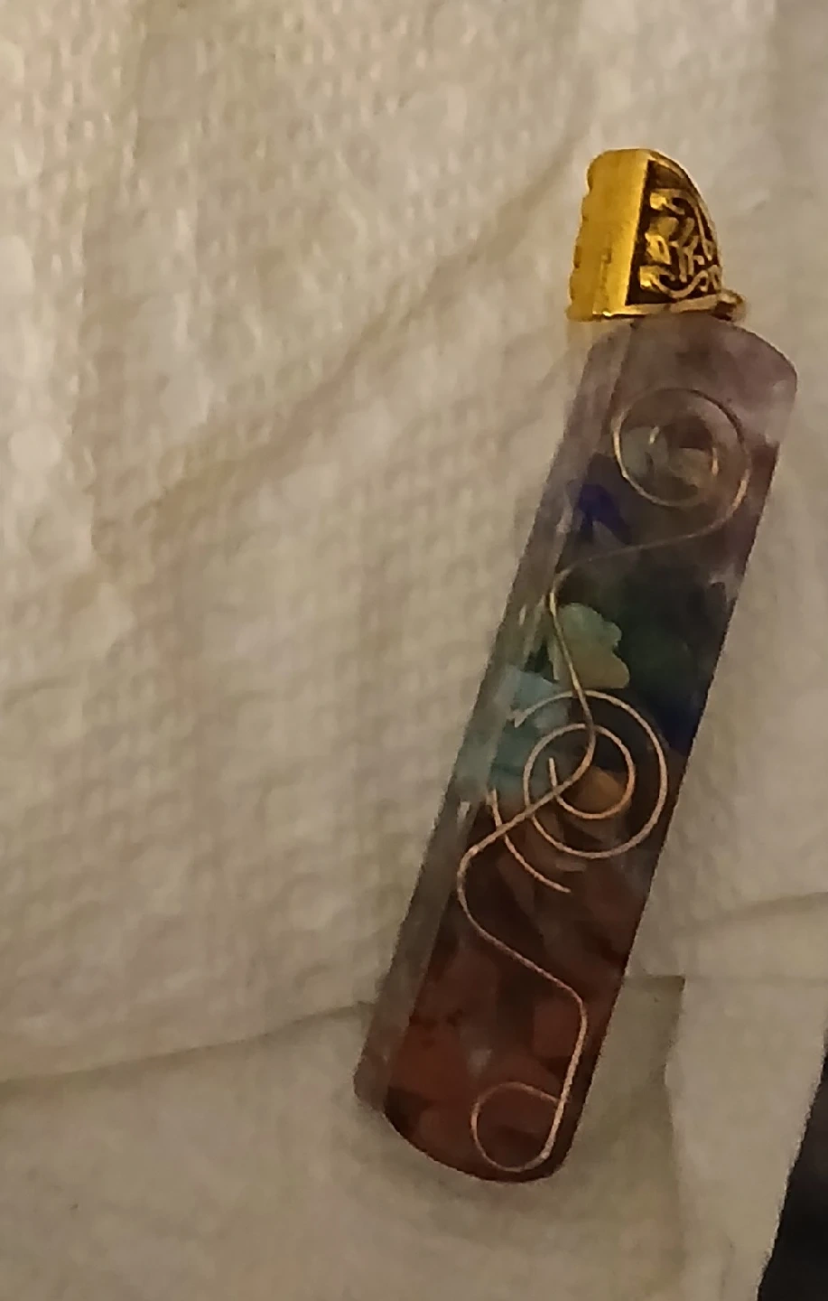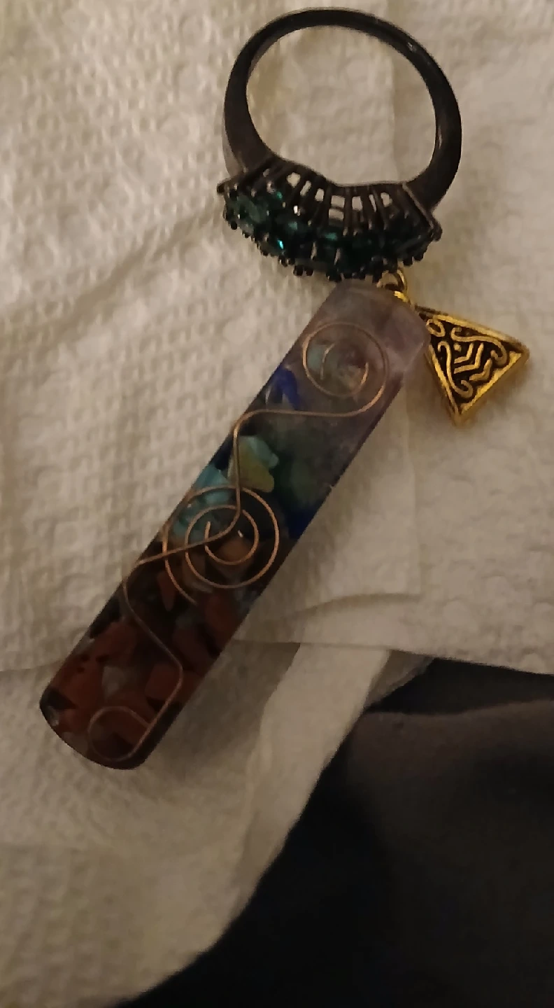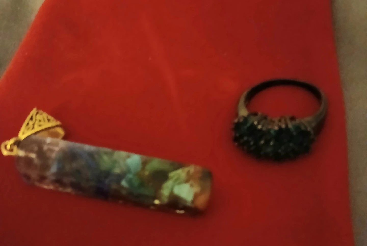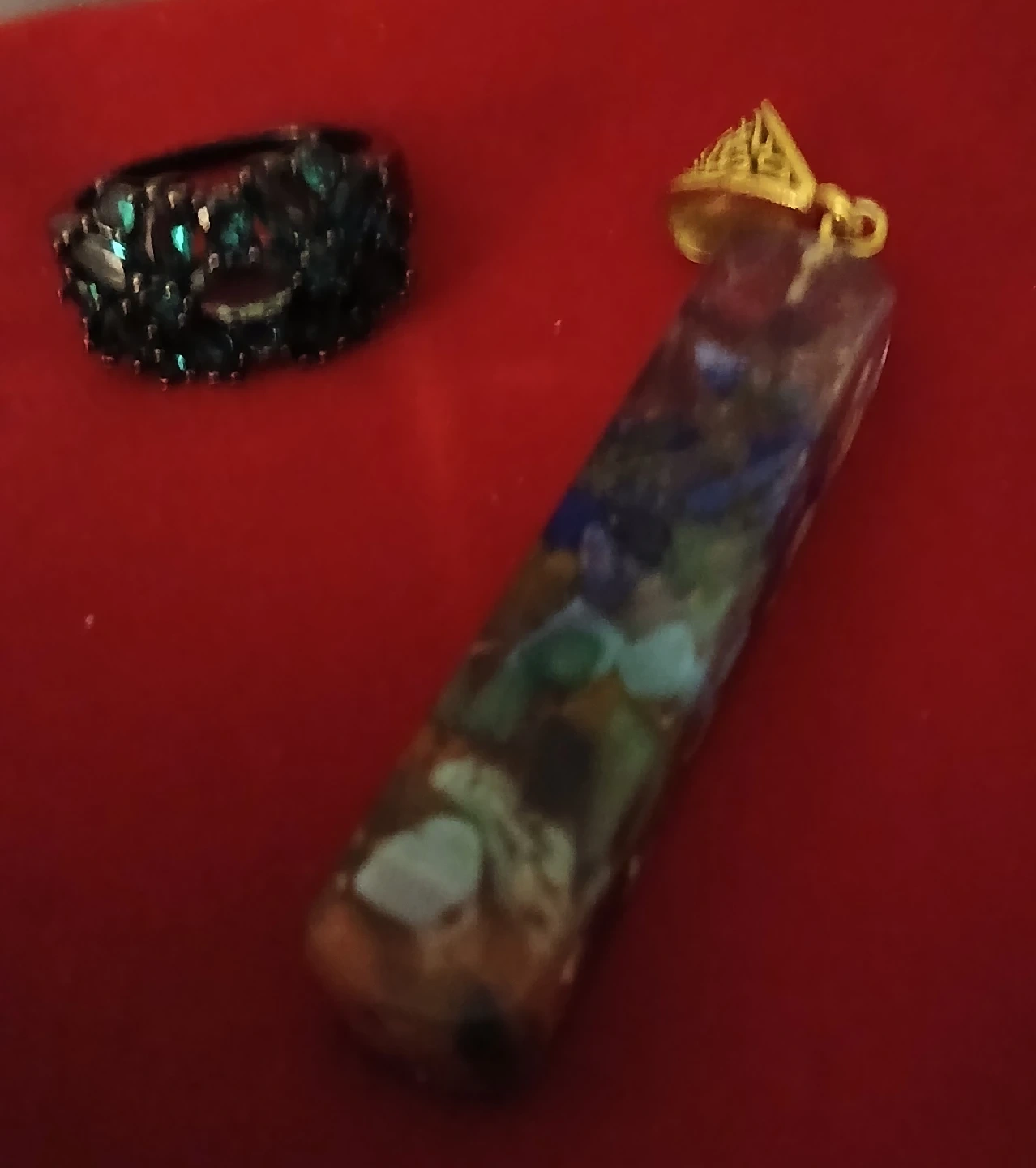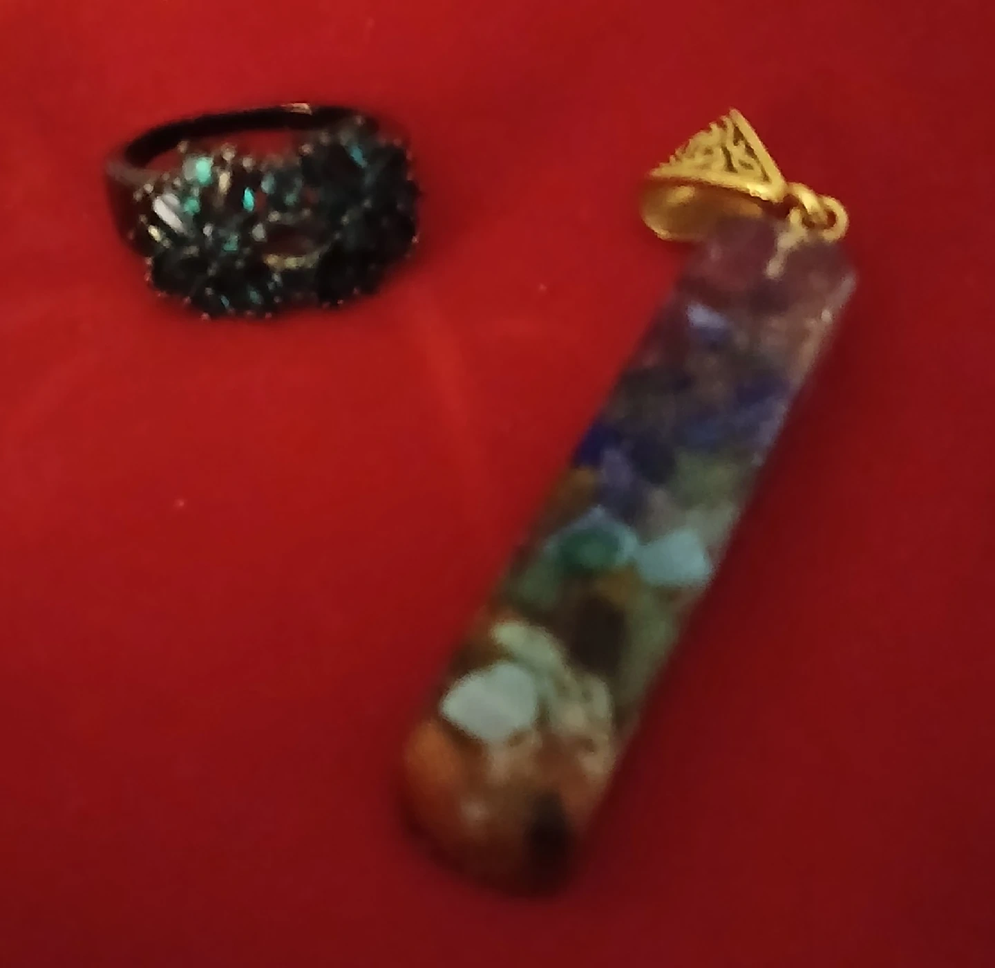 1000+Selling a chalkra pendant and ring set. The pendant has a gold-tone bail and a resin body with embedded stones. The ring is dark metal with green stones.