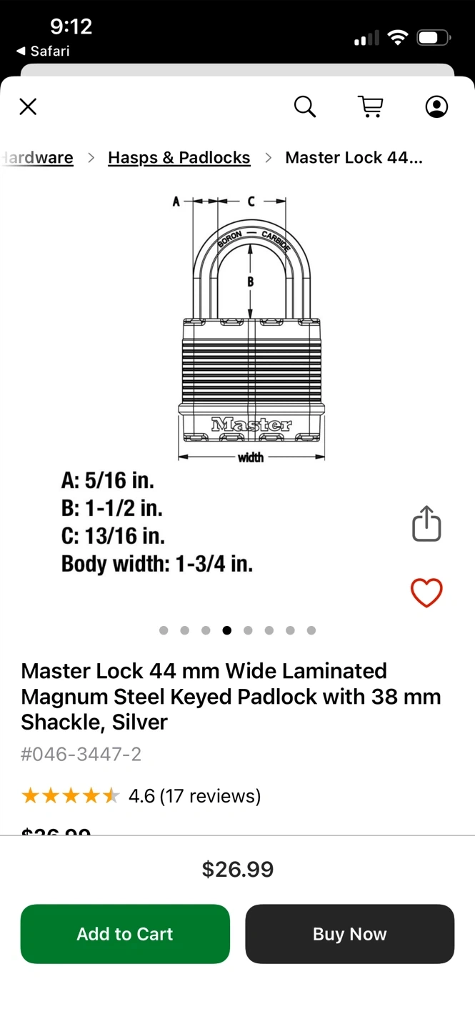 This Master Lock padlock is 44mm wide with a Magnum steel body. It comes with two keys. The shackle is 38 mm long and made of boron carbide for durability. Great for securing your belongings!