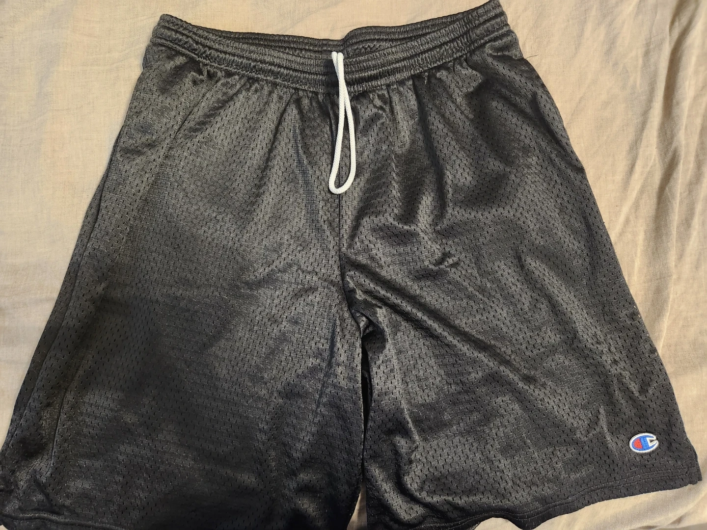 10Selling a pair of Champion mesh shorts in black. They're in great condition and perfect for sports or just lounging around. The material is lightweight and breathable, making them super comfy for everyday wear