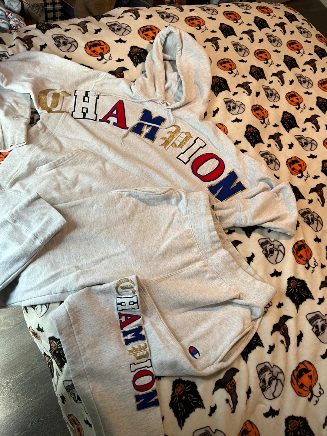 109Selling a Champion Reverse Weave set, including a hoodie and matching sweatpants! The set is a light grey colour, and both pieces are a size medium. The Champion logo is displayed vertically in a cool, vintage-inspired design. Perfect for staying cozy and stylish!