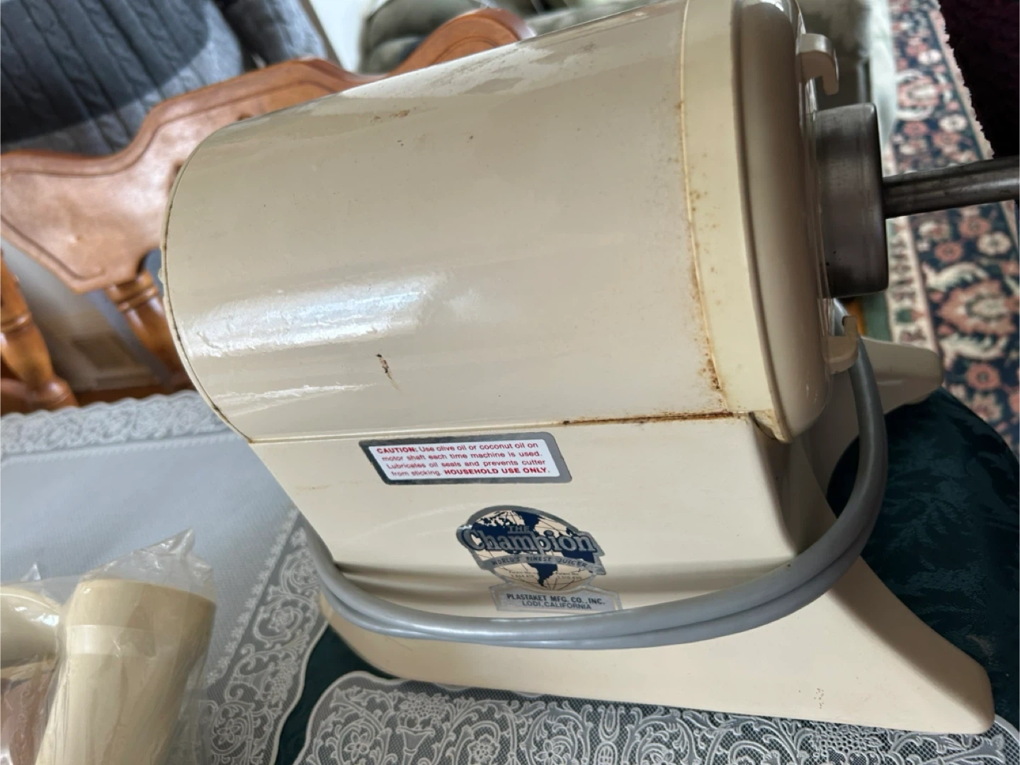 Selling a Champion Juicer for household use. It comes with the original packaging and components. This sturdy juicer is ready to help you make fresh and healthy juices at home!