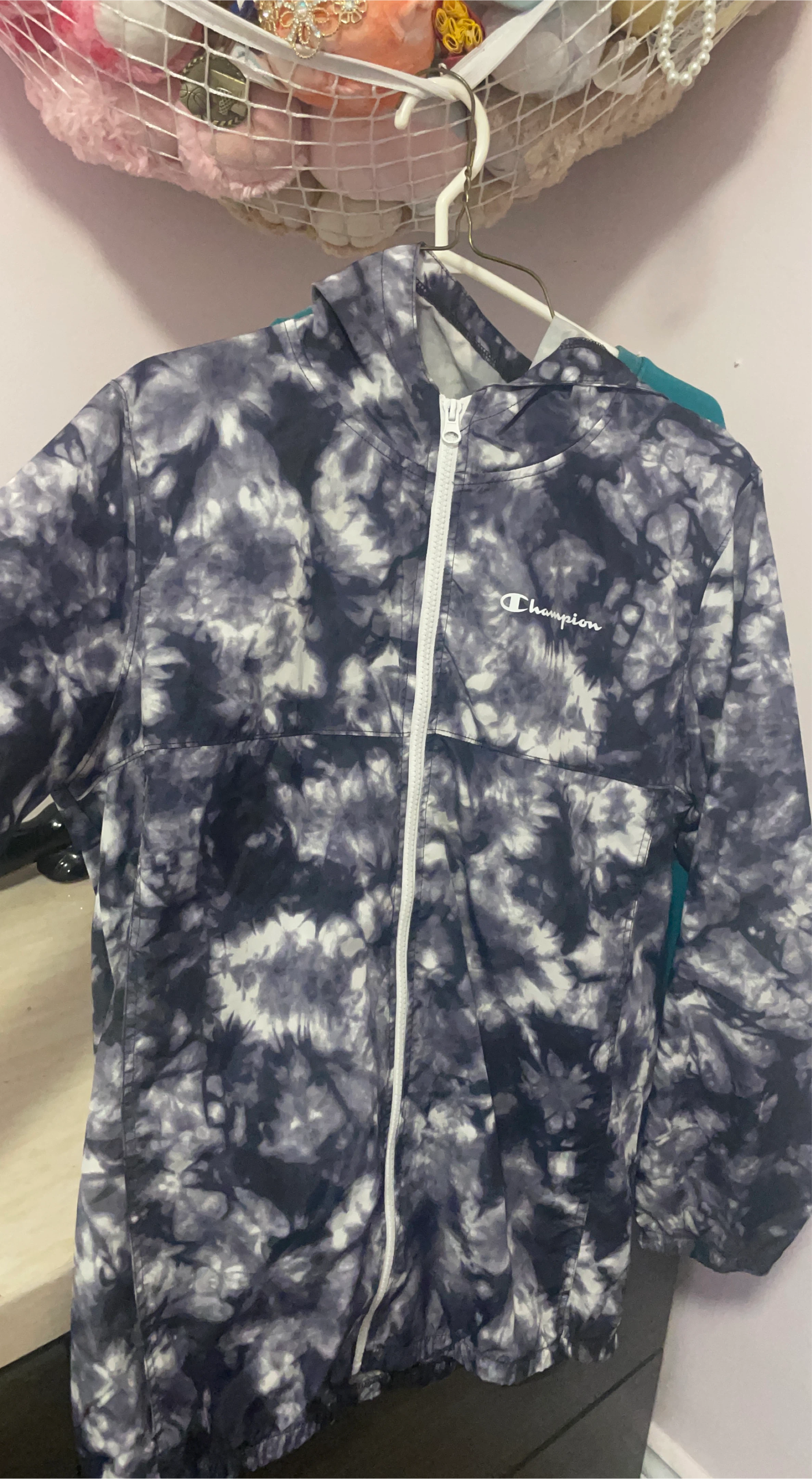 Champion jacket with a cool tie-dye pattern! This windbreaker is perfect for layering or wearing on its own. It's in great condition and ready for a new home