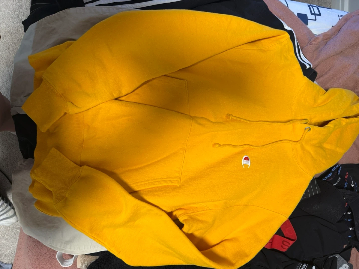 65Selling a cozy Champion hoodie in a vibrant yellow colour! It's in great condition and perfect for staying warm and stylish. The classic Champion logo is on the chest, adding a touch of sporty flair to this comfortable hoodie