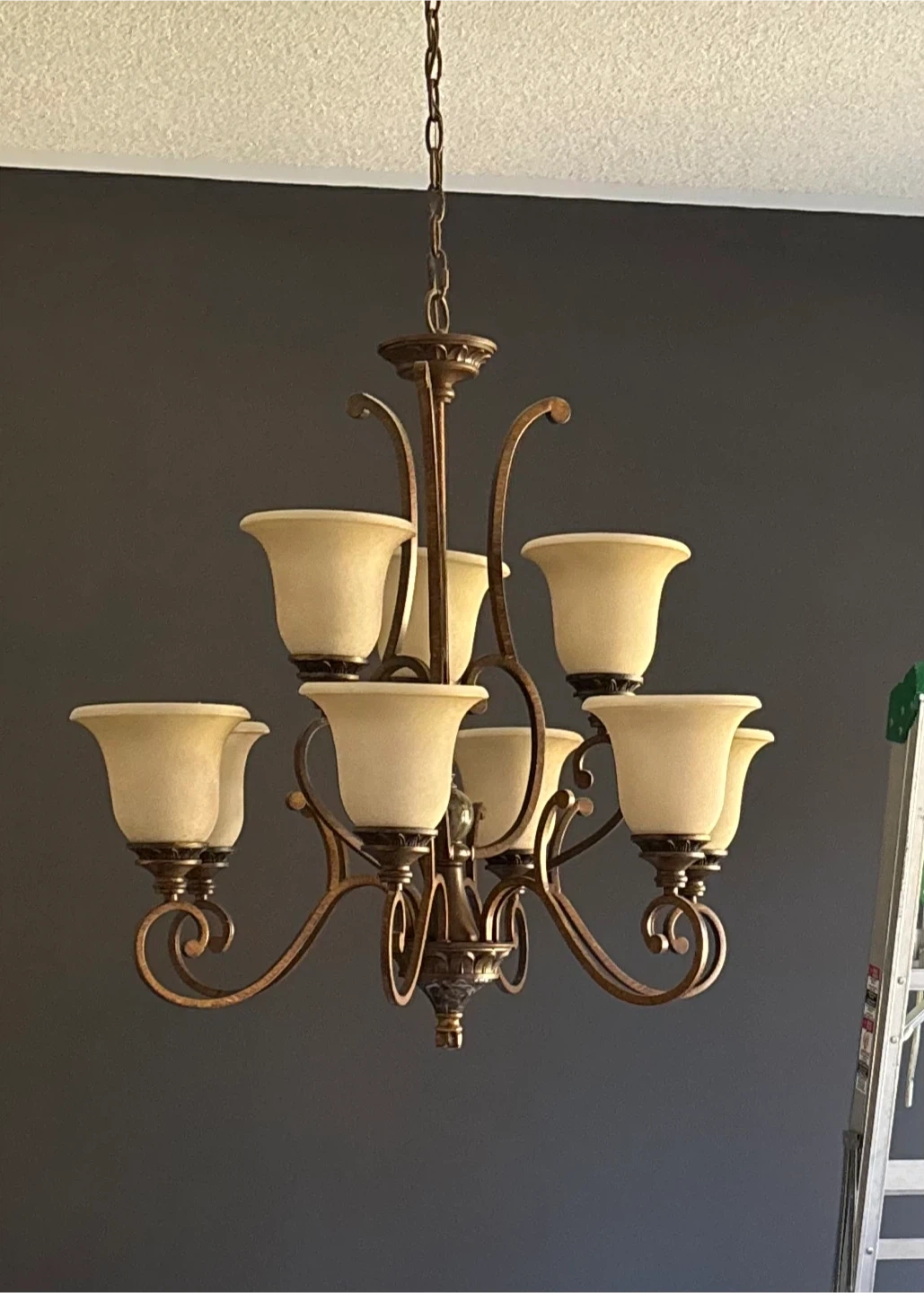 10Selling a chandelier with a bronze finish and 9 lights. It would look great in a dining room or entry way!