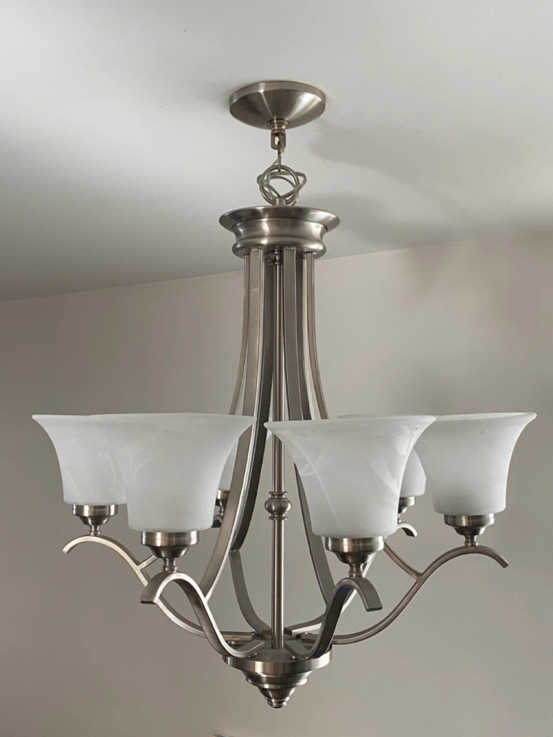 Selling a chandelier with five lights. It's in great condition and would look lovely in any dining room or living room. The fixture has a brushed nickel finish and comes with the frosted glass shades. Ready to brighten up your space! Can be delivery but need extra $5 to $10, depends location! The price also negotiable.