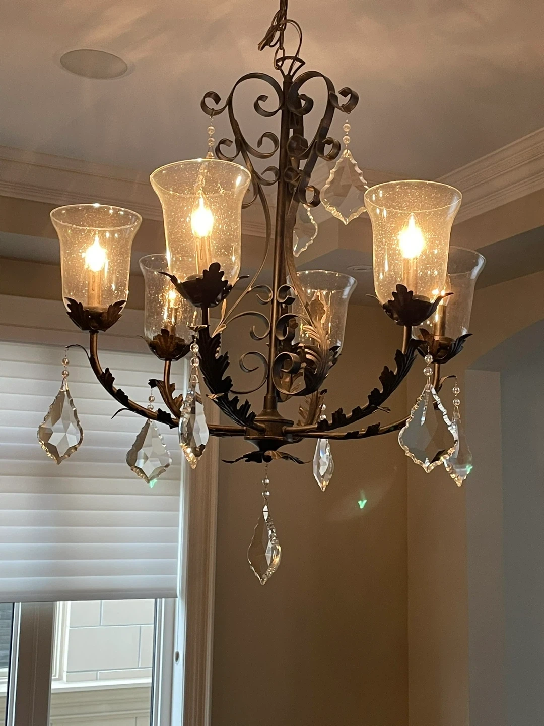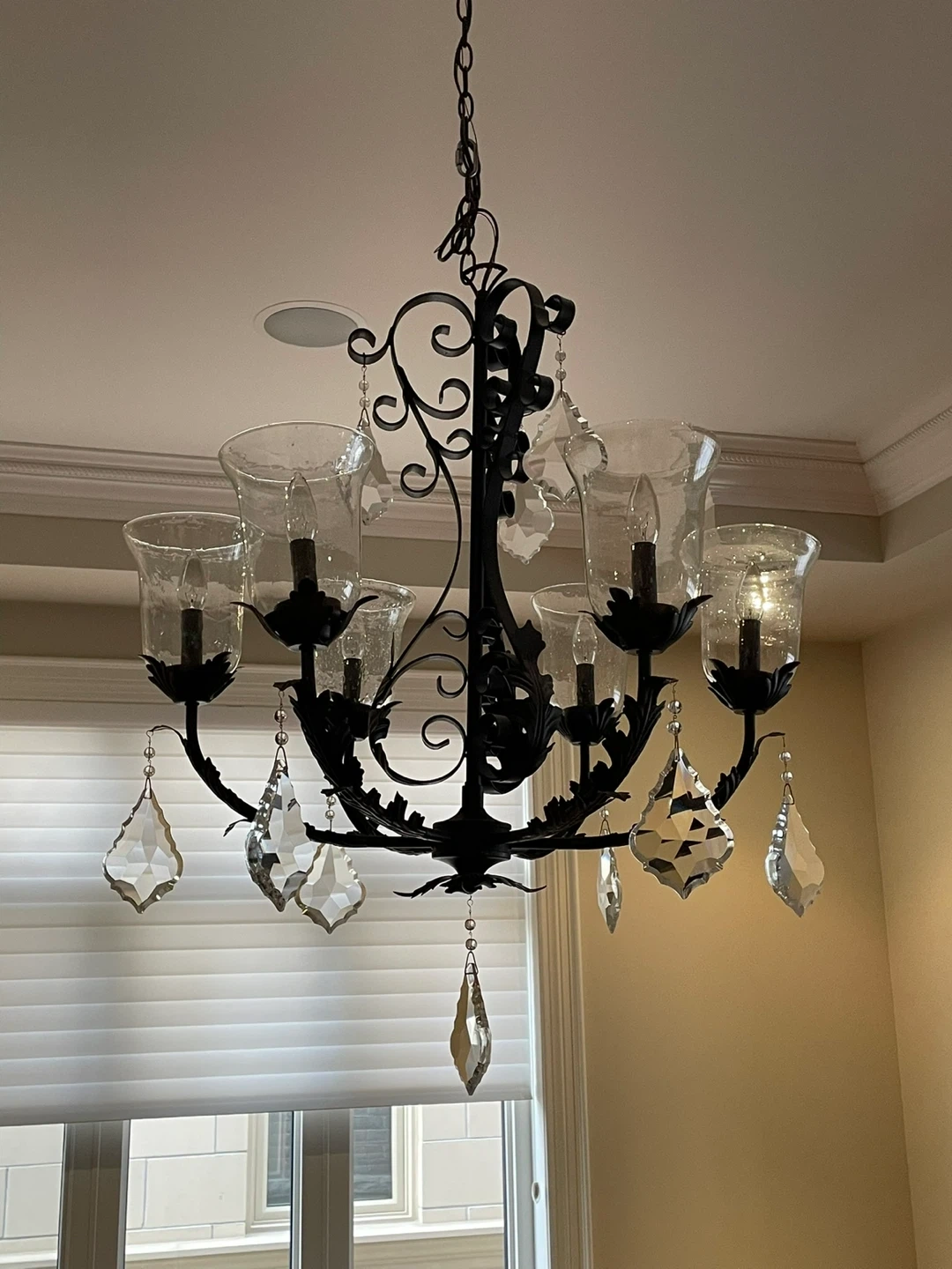 10Selling a beautiful chandelier that would add a touch of elegance to any room. It features a dark metal frame with ornate detailing, complemented by clear glass shades and sparkling crystal accents. It's in great condition and ready to brighten up your space!